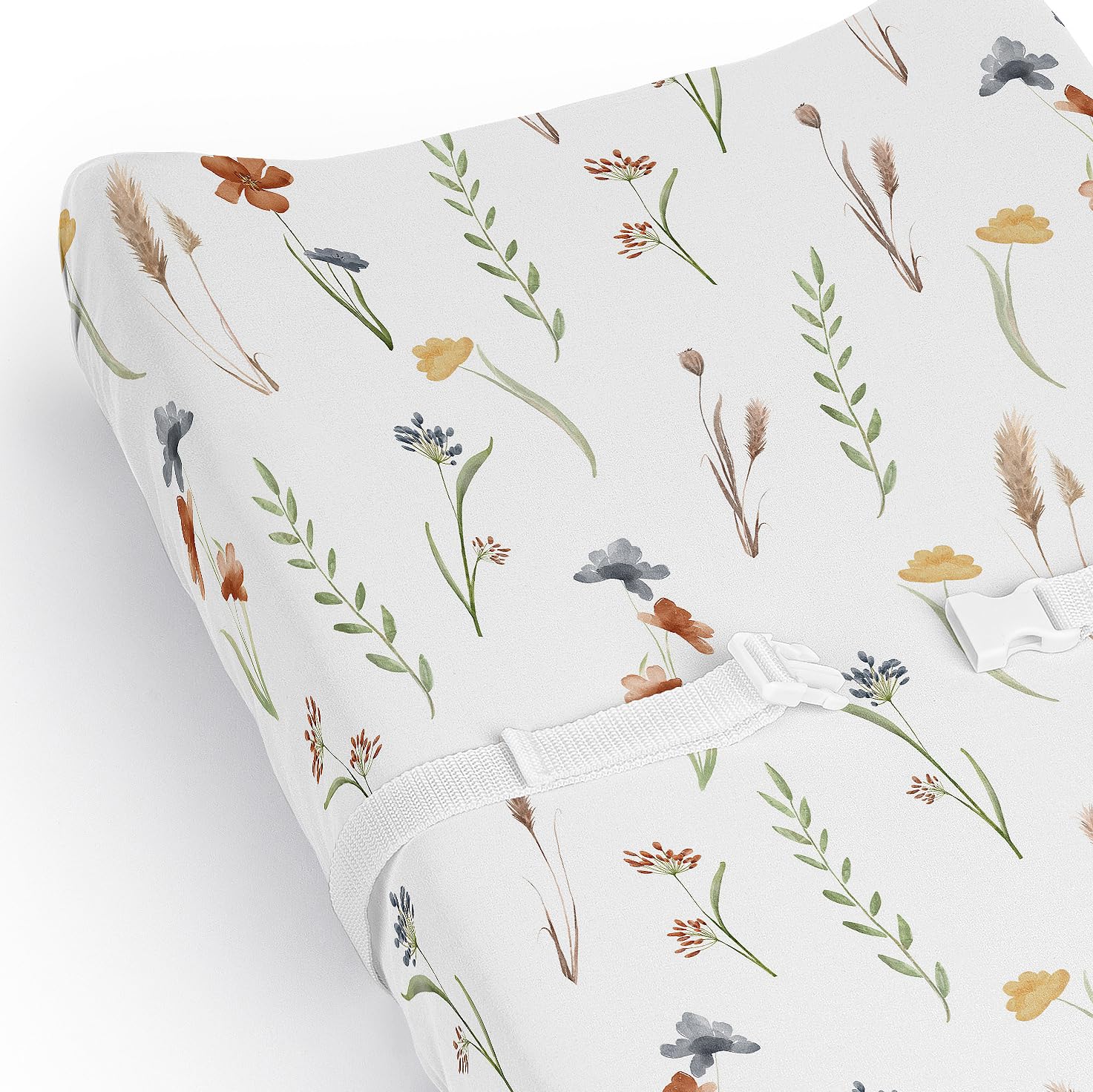 This brushed microfiber diaper pad cover sheet features an exclusive design of a sage green, beige, blue, rust orange and taupe boho floral garden flower nature watercolor bohemian farmhouse vintage shabby chic wildflower print.