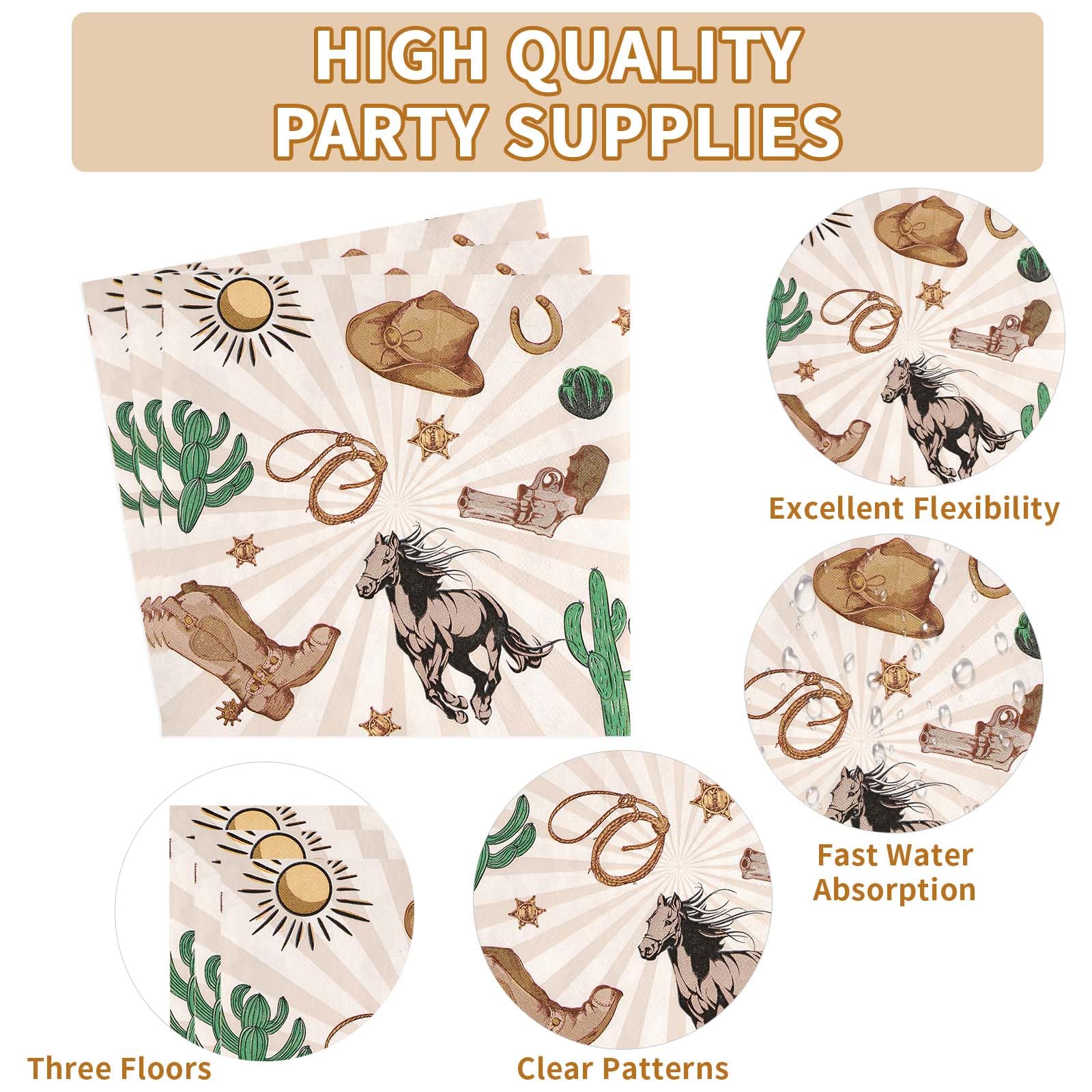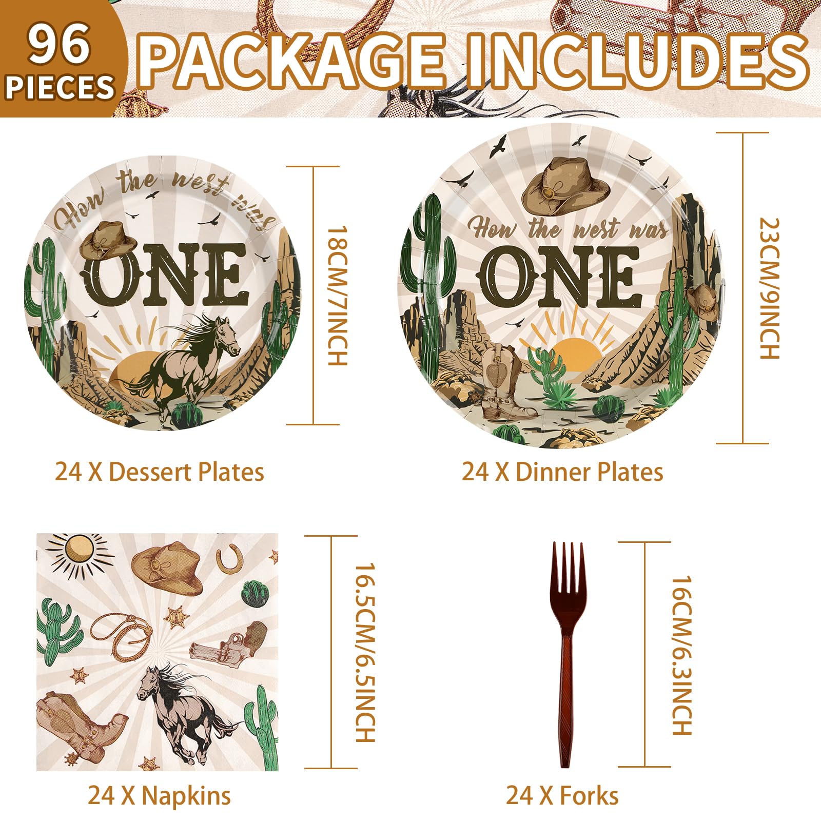 Western Cowboy Party Supplies:You will receive a 96 PCS cowboy 1st birthday decorations supplies tableware set, including 24 9"western cowboy plates, 24 7" western cowboy dessert plate, 24 western cowboy napkins and 24 plastic forks for 24 guests. All in one, easy to use, make party preparation more convenient, meet the needs of birthday and other theme parties.