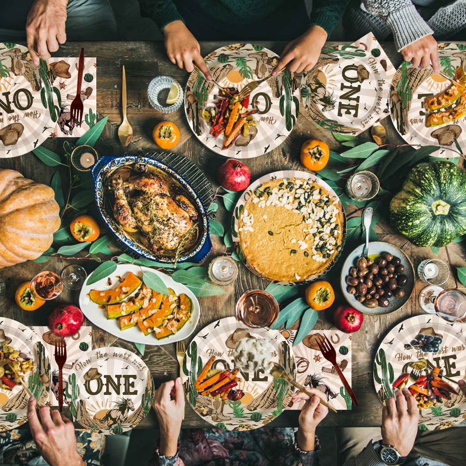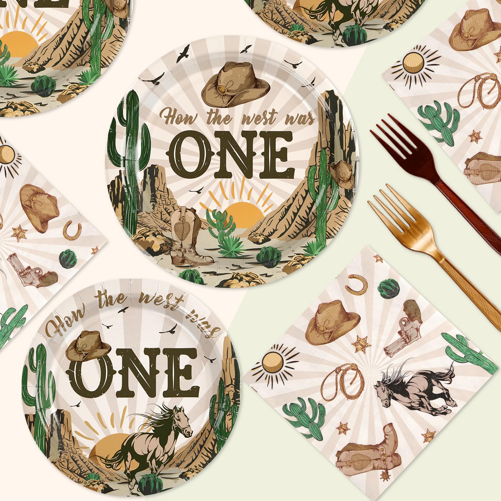 Western Cowboy Party Decorations:The western party plates supplies feature a rustic and western-inspired design that brings the charm of the old wild west to your party decor.With images of cowboy hats, cowboy, horses, saddles, cactai and "How The West Was One" motifs, these plates create an authentic Wild West atmosphere, perfect for a Western-themed celebration. The design elements on the plates evoke the spirit of adventure and ruggedness.Let your boy start his western first rodeo party