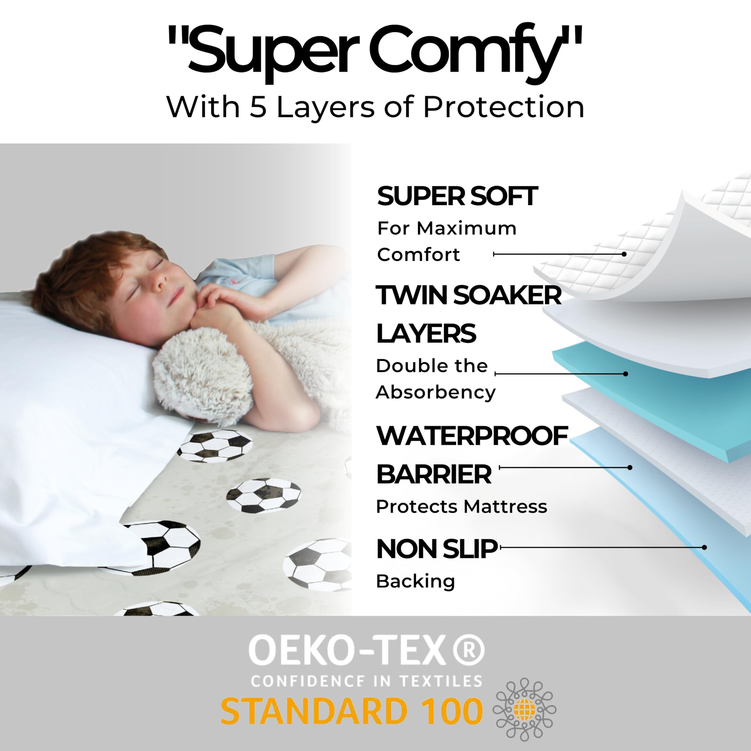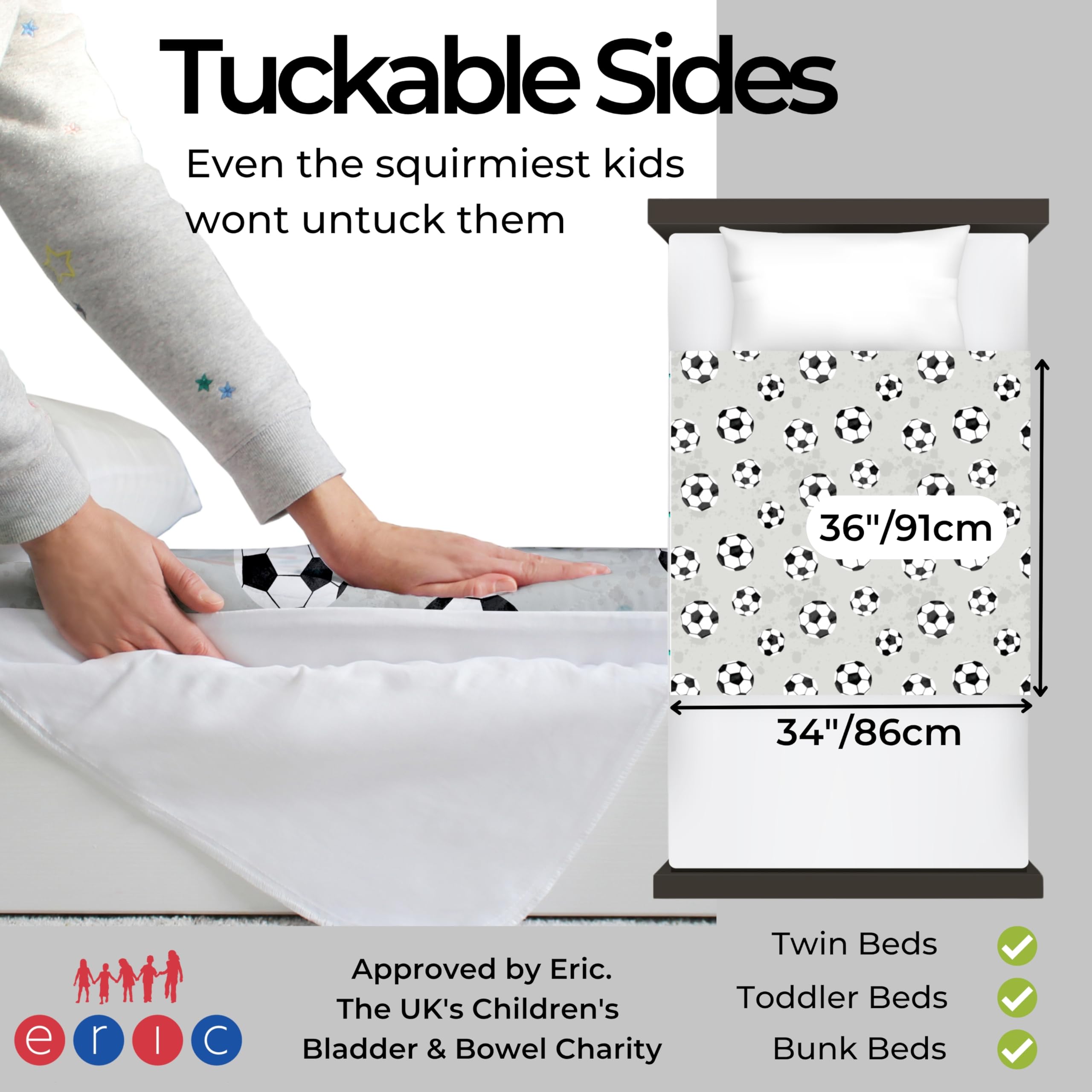 ⚽ SUPER ABSORBENT - Hygge sheets bed wetting protection pad for kids have 5 layers of protection, which ensure that your mattress remains 100% dry and protected against night time accidents. The bedwetting pads are 34" x 36" (plus tucks) and a perfect fit for twin, toddler and crib beds. Not suitable for under 2 years old.