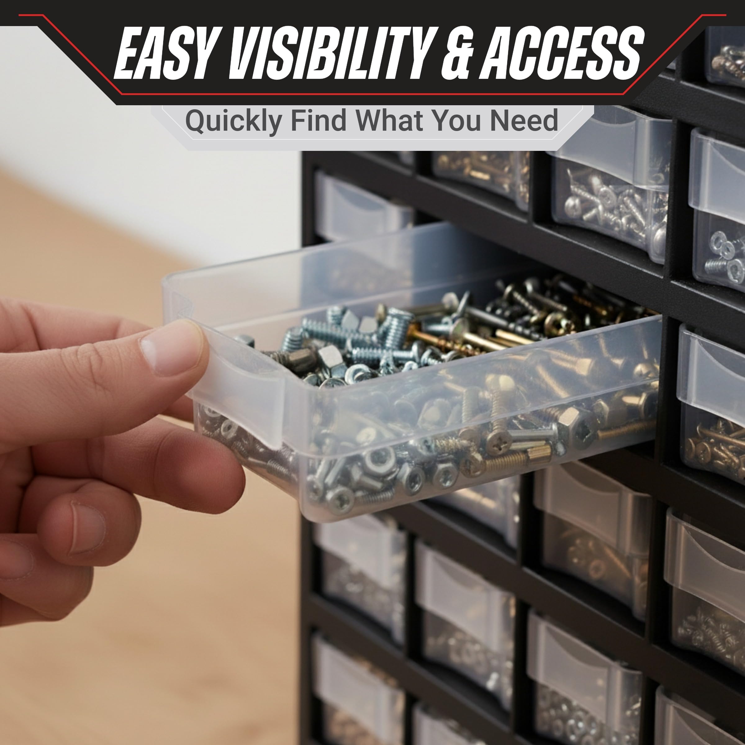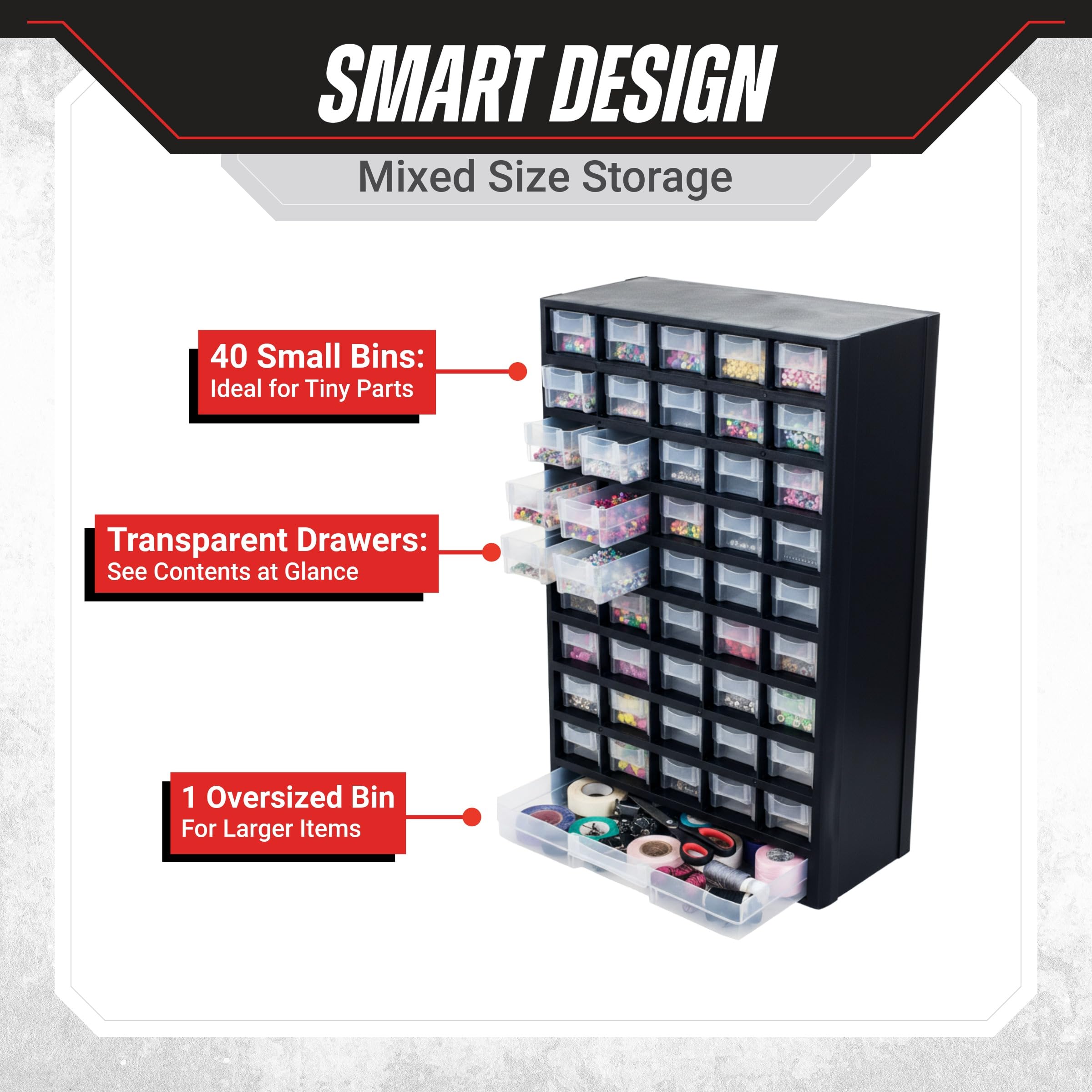SMART DESIGN - The mix of compartment sizes is ideal for organizing a variety of items. Each unit features 40 small bins and 1 oversized bottom drawer. The clear material allows you to see the contents, and they have easy-open finger pulls.