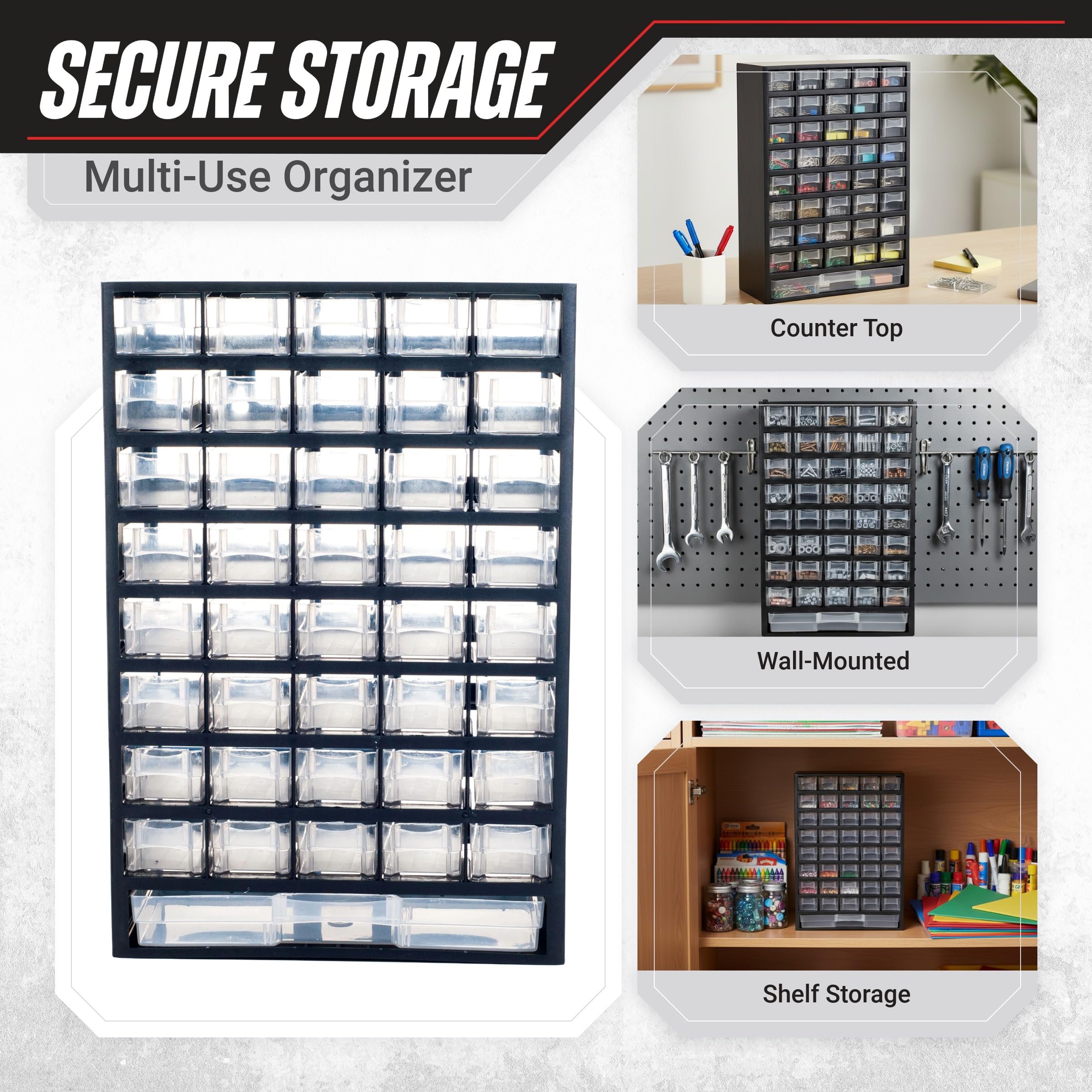 The Plastic Storage Drawers by Stalwart are an excellent organizational solution for your garage, home, playroom, or office. Constructed from strong and durable plastic, this see-through small parts organizer with drawers is made to last. The screw organizer offers 40 small compartments and one oversized compartment to allow you to easily store anything from parts, hardware, office supplies, fishing tackle, to crafting materials, beads, makeup, jewelry, and more. Stalwart, for storage solutions that are SMART, STRONG, and SECURE. IMPORTANT: Stalwart is committed to providing the consumer with the absolute best price and value on all of our products. NOTE: This is an exclusive product of Stalwart and ONLY Craft Organizers and Storage by Stalwart are GUARANTEED to be genuine. Avoid buying counterfeit products and transacting with unauthorized sellers. Stalwart is a registered trademark protected by U.S. Trademark law and will be vigorously defended.