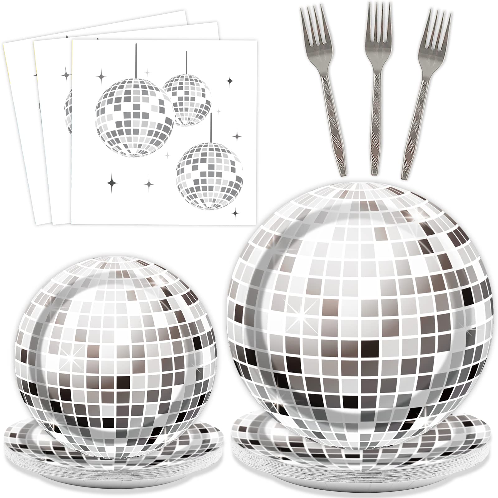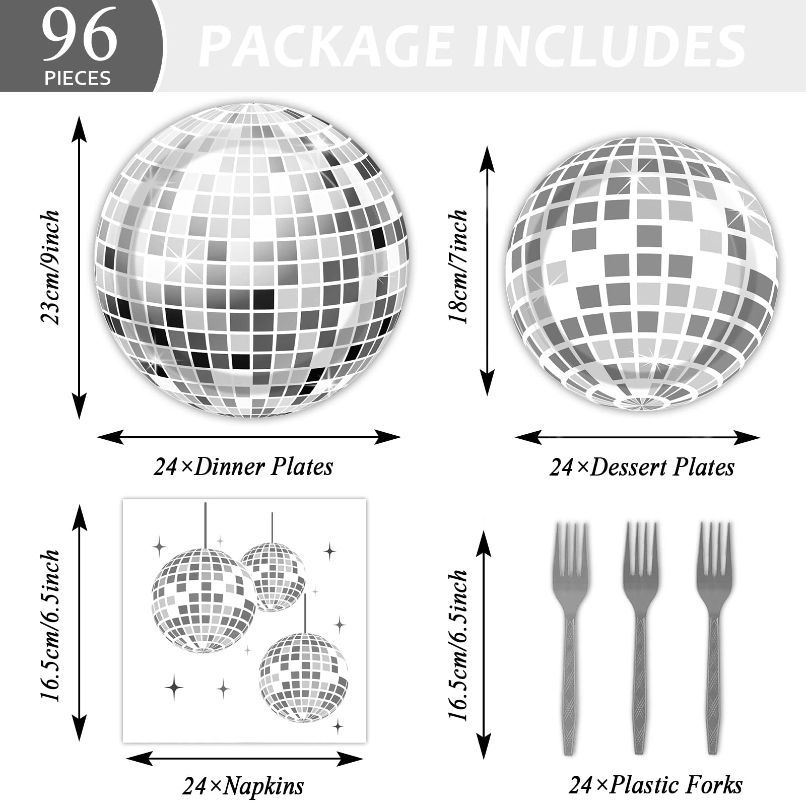 Package includes: This disco plates can serve 24 guests which includes 24 9 inches disco ball plates , 24 7inches disco paper plates, 24 sliver forks and 24 double-ply napkins. Disco party plates of different sizes are available for you to choose from and disco ball theme tableware set are enough for your birthday party.