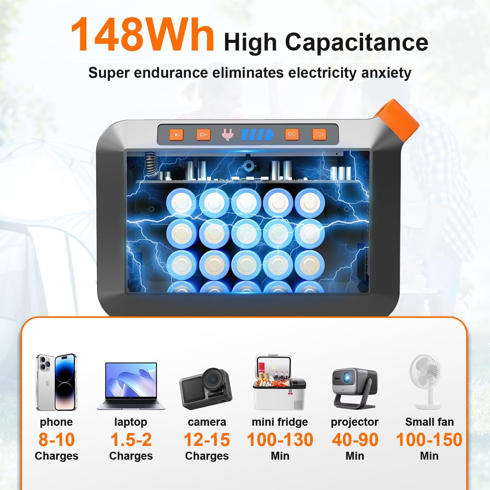 MULTI-OUTPUT OF POWER STATION: Features with AC/DC/USB outputs: 2*AC wall socket(200W with 270W peak, including 2 prong and 3 prong outlets), 2*USB A QC3.0 ports(5V⎓2A, 9V⎓2A, 12V⎓1.5A, 18W Max), 2*USB A ports(5V⎓2.1A, 15W Max), 1*USB C port(5V⎓3A, 9V⎓2A, 12V⎓1.5A, 18W PD), 1*DC port(12-16.8V⎓10A, 14A, 200W Max). Perfect for charge phone, laptop, iPad, camera, wireless headphones, etc.