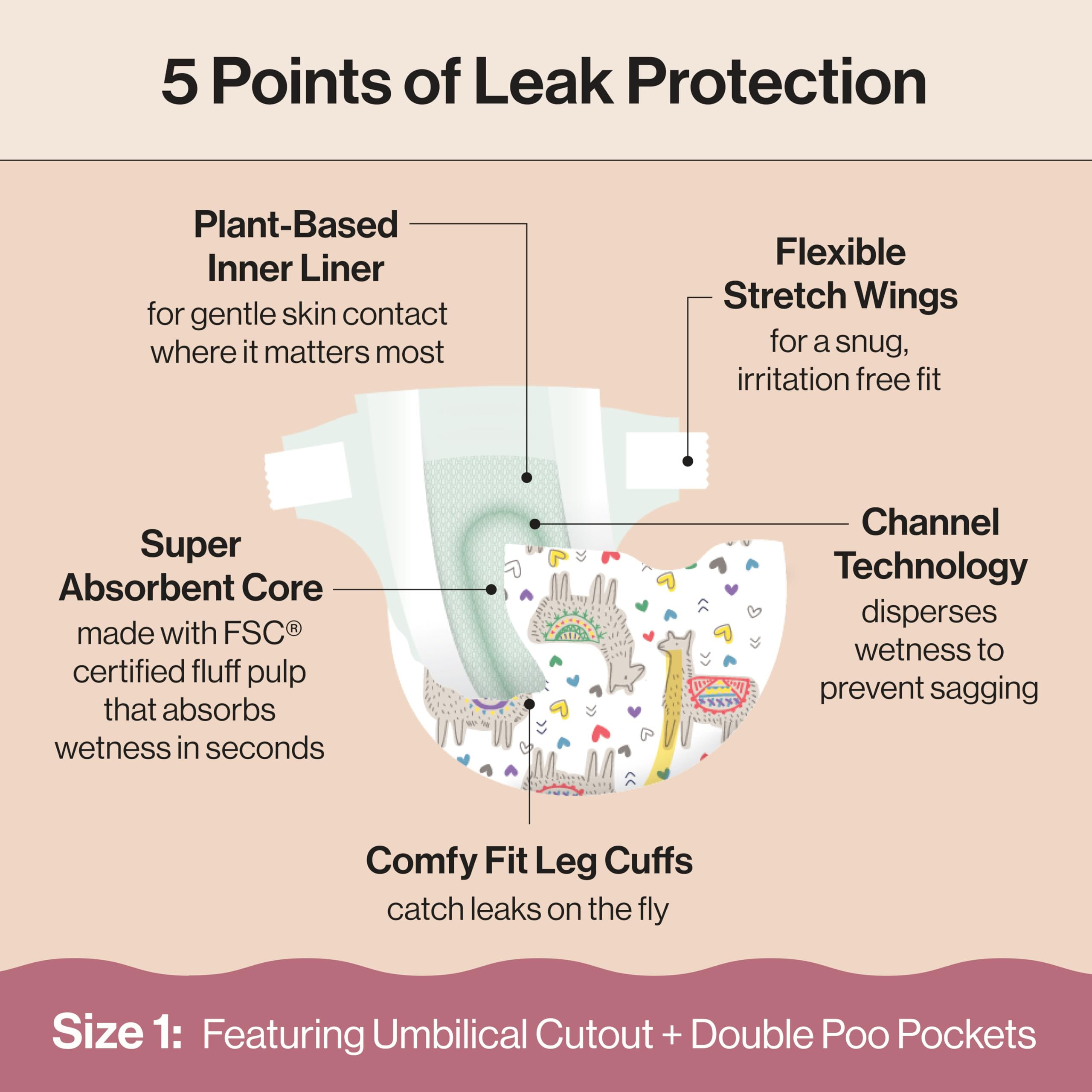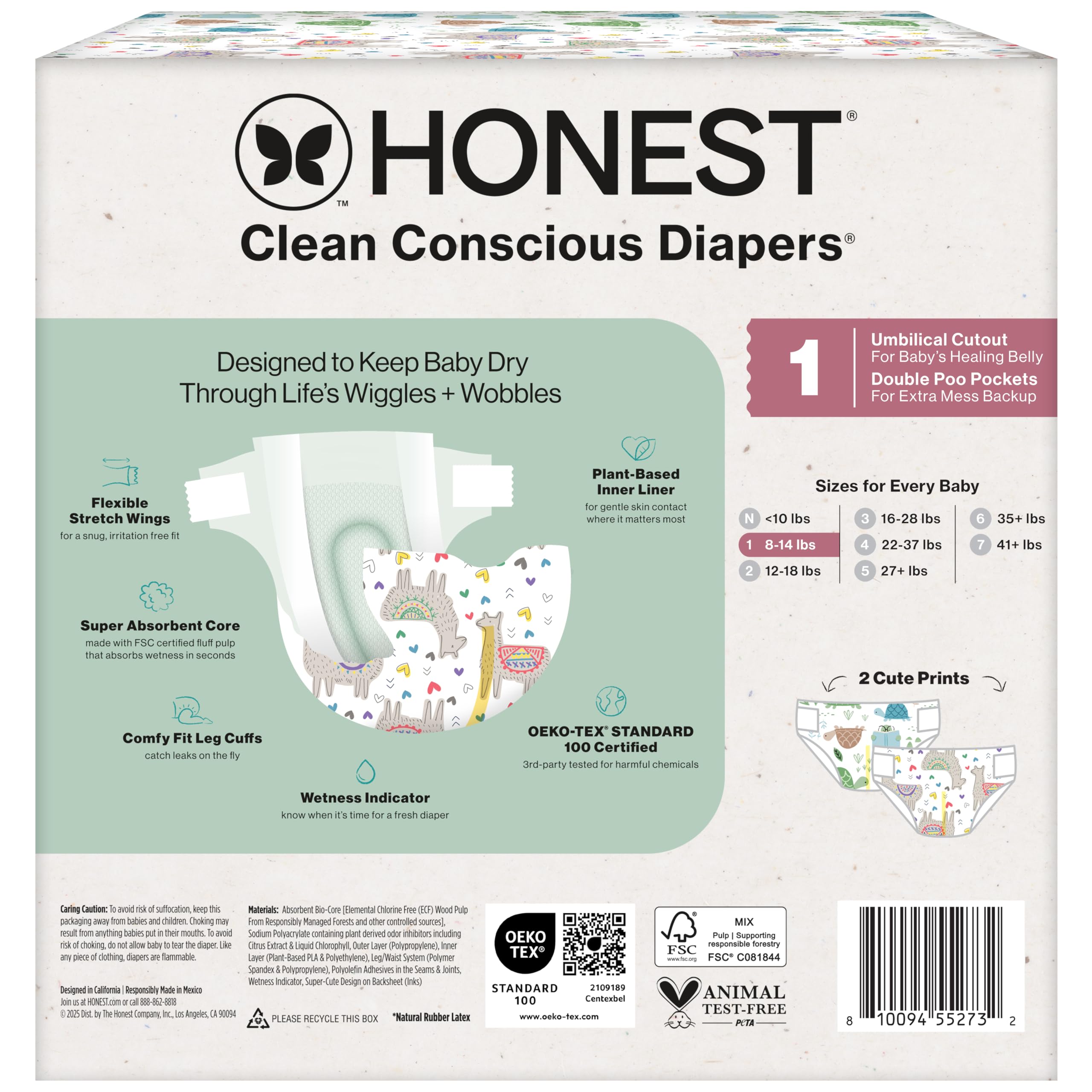 Designed to protect delicate skin, Honest Clean Conscious Diapers keep baby comfortable and dry through all the wiggles and wobbles! Our softest diaper yet delivers up to 100% leak protection with Comfort Dry Technology. The hypoallergenic, plant based inner liner, flexible stretch wings, super absorbent core, and channel technology provide a comfy, secure fit for all ages and stages. Because safety is top priority, these diapers are OEKO-TEX STANDARD 100 Certified, a 3rd party that tests for 350 harmful chemicals, and made with FSC Certified Fluff Pulp and other controlled materials. And for cuteness overload, each diaper features a super cute print!