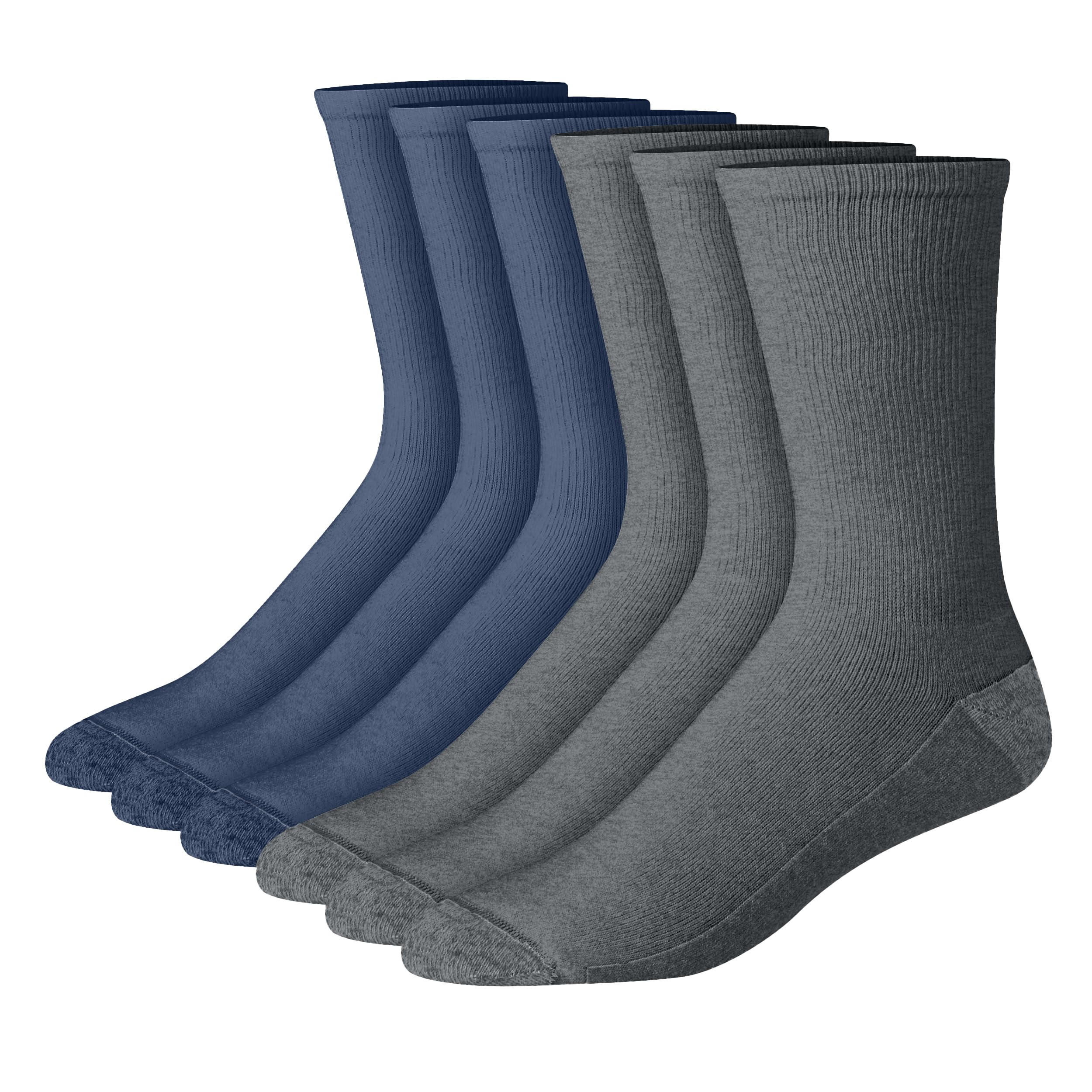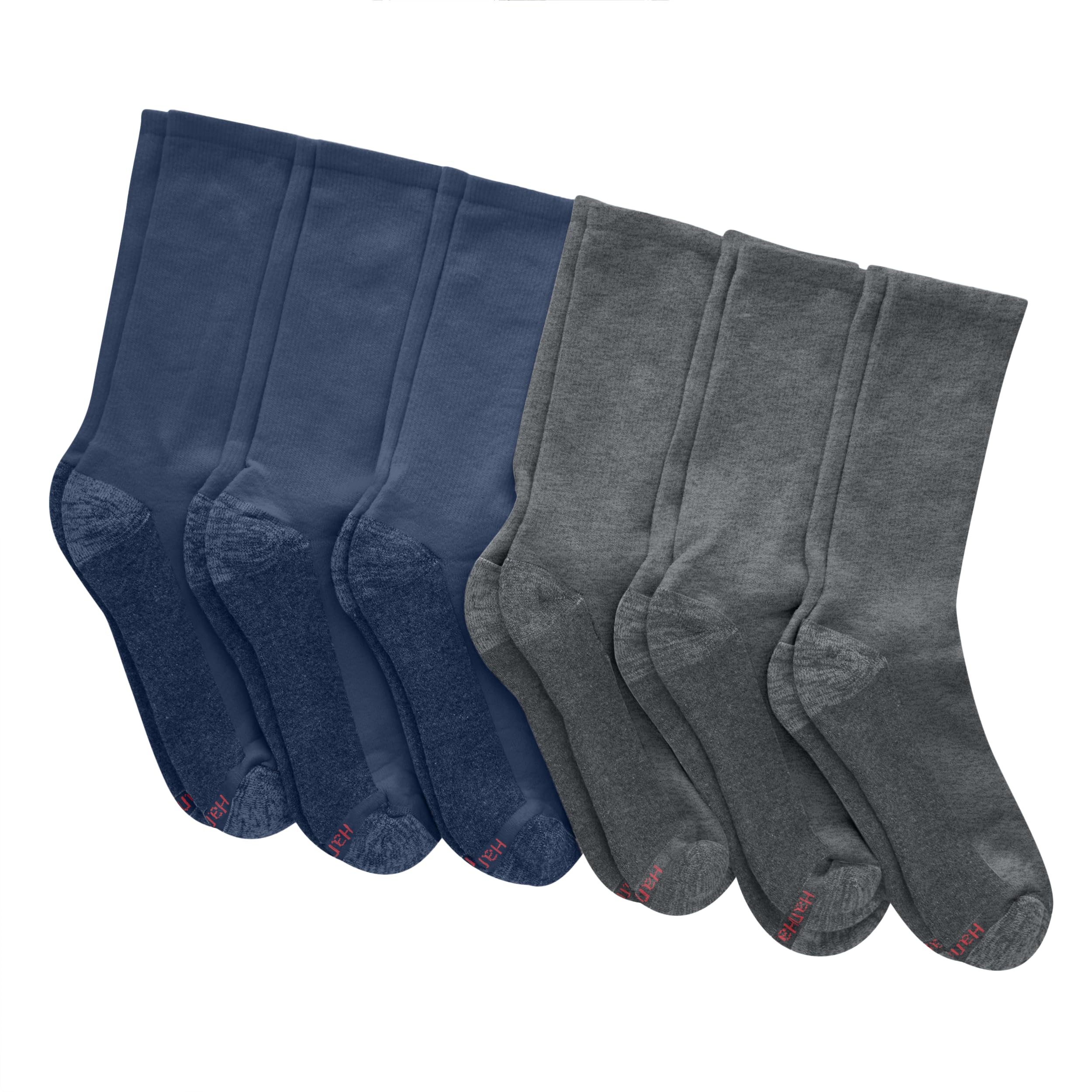 Description For sports or everyday wear, you'll appreciate the comfort and construction of Hanes® Max Cushion crew socks. These soft but Double Tough classic crew socks are made to last with a reinforced heel and toe, all the while cradling your foot with extra cushioning you'll feel with every step. These basic crew socks for men are made with Hanes' high-tech features, including Cool Comfort® fabric that wicks away moisture to keep feet cool and dry, and FreshIQ™ advanced odor-fighting technology that attacks odor-causing bacteria to keep feet smelling fresh. Smooth toe seams enhance comfort even more, and a touch of spandex in the fiber blend assures a stay-in-place fit. Stock up on these made-to-last crew socks and fill your sock drawer with comfort.