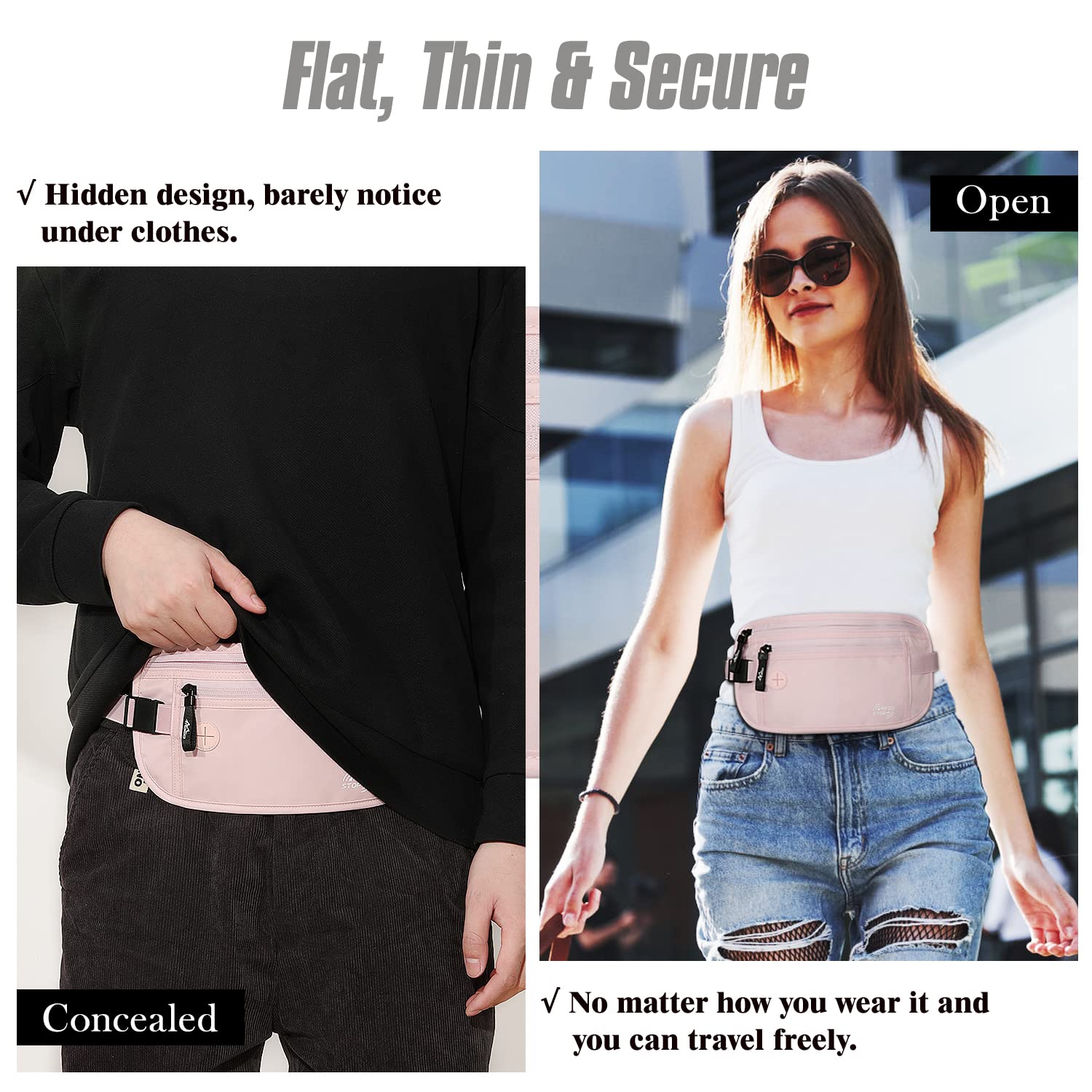 【HIDDEN & CONVENTIENT】- With 3 perfect-fit individuals pockets, the slim lightweight design ensures travel money belt is discreet and invisible to others when worn under clothes, a secure solution to keep your ID card, credit cards, passport, cash, cell phone ,keys and other valuables safely and protect it from pick-pocketing. Not just use in travel, but also in sports and other occasions, as passport holder, running waist belt or fanny pack.