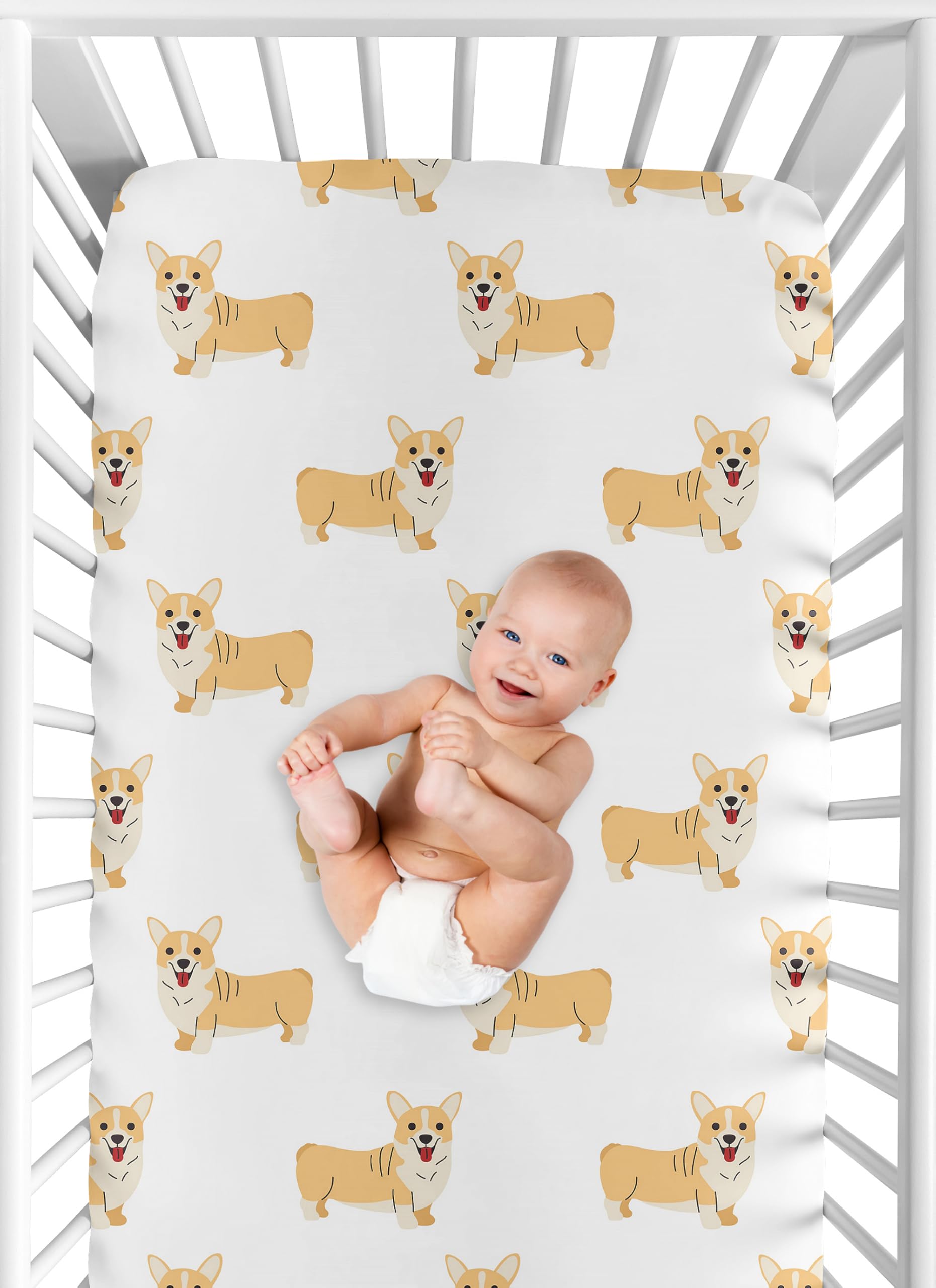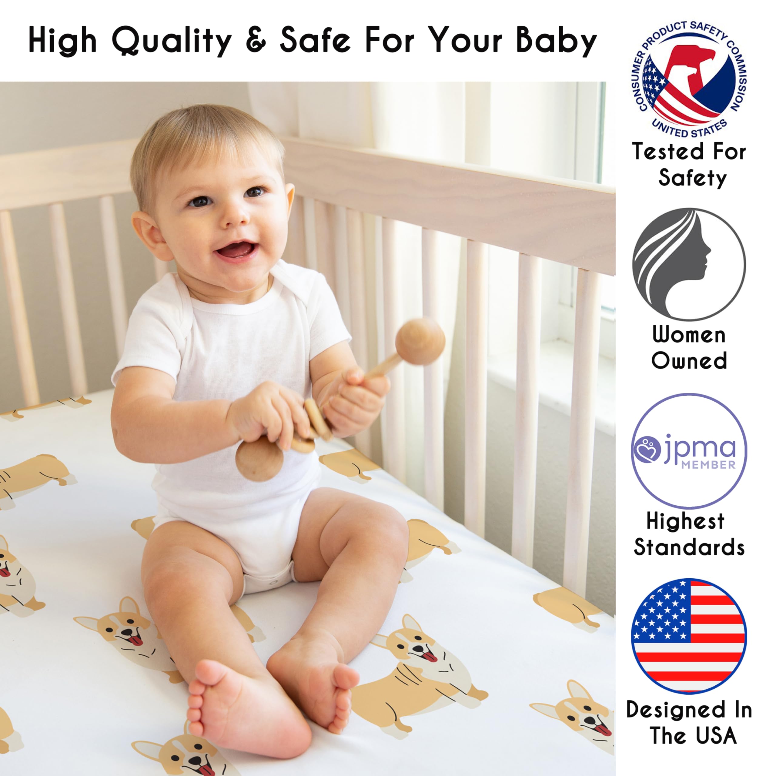 DESIGNED IN THE USA: By real parents who understand the need for comfort, practicality, and style. Sweet Jojo Designs is a small, women owned business. The mom's on our team know a crib mattress sheet is first priority for your baby essentials to ensure a restful night of sleep. We use top fabrics and designs to create soft crib sheets that are stretchy and comfortable for your infant or toddler. We've studied the latest trends in corgi dog crib sheets neutral to bring you the finest product.