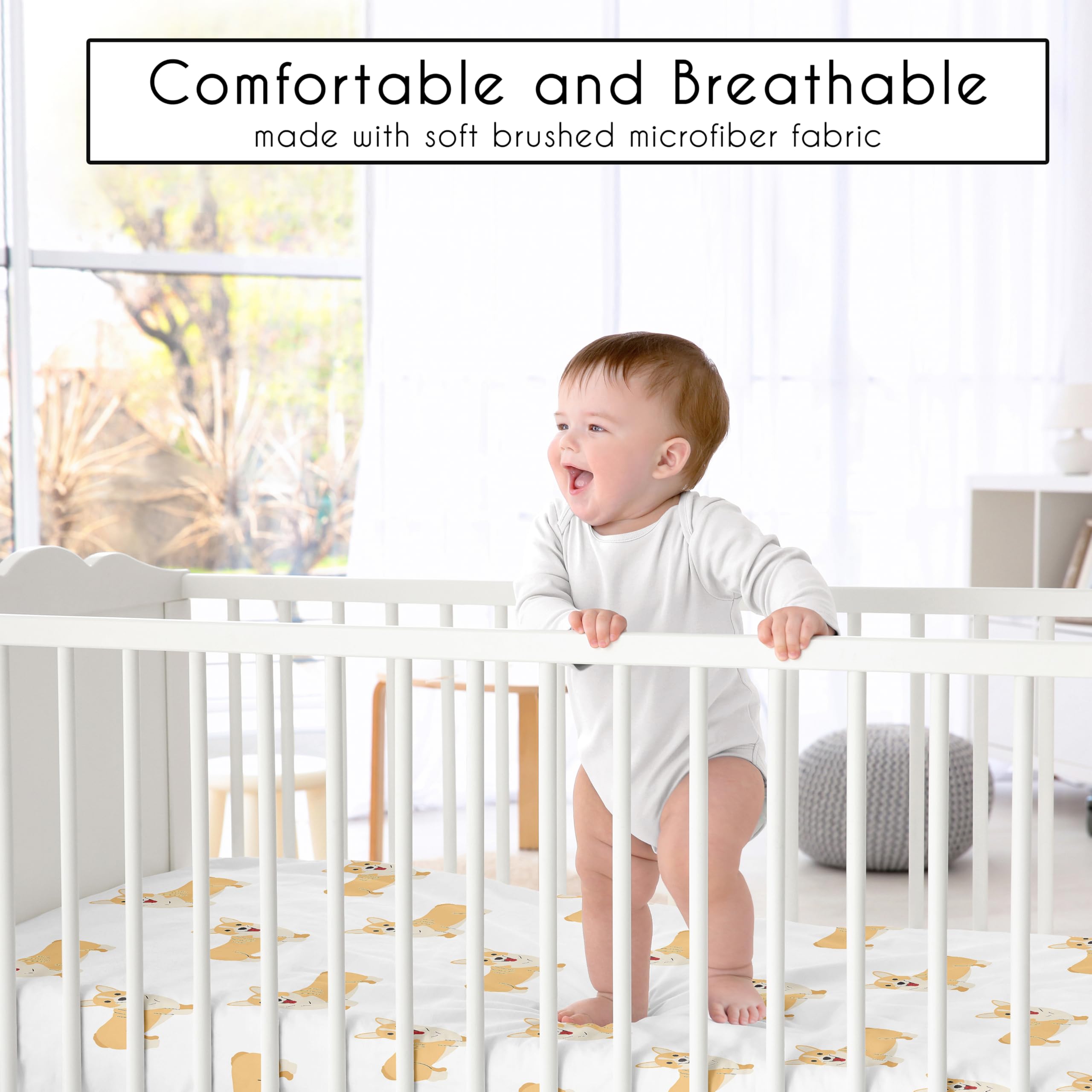 SNUG FIT: Includes (1) Fitted Crib Sheet 52in. x 28in. x 8in. Our newborn standard crib sheets fit snugly, with premium elastic sewn around the entire bottom edge for a secure fit on most standard sized cribs and toddler beds, to reduce shifting and bunching. This brushed microfiber crib sheet features an exclusive trendy design of a whimsical modern cartoon illustration style orange and white corgi dogs and puppies print and is gentle on delicate skin to foster a soothing sleep environment.