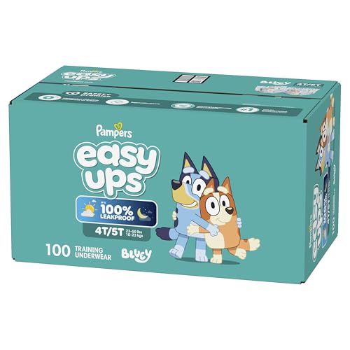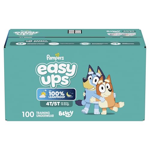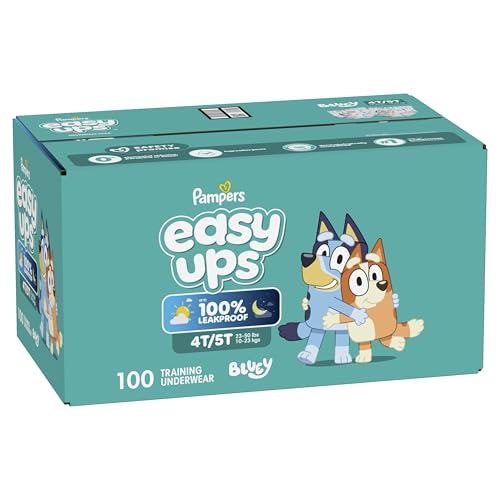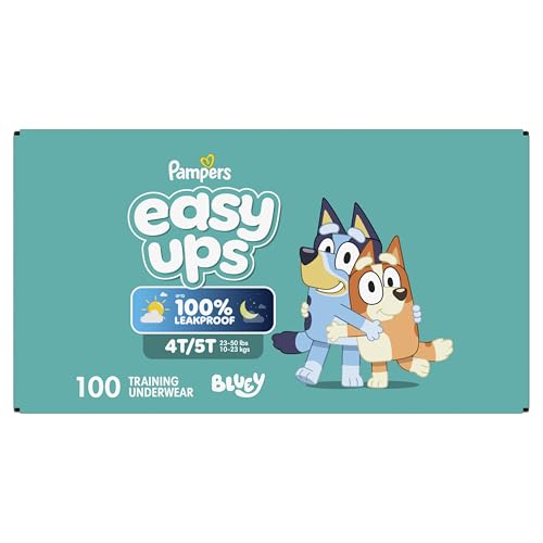 Ready to potty train with bluey? Pampers Easy Ups Training Pants featuring bluey makes it easy. They pair the feeling of real under wear with the protection of Pampers to make potty training easier for everyone. Give your child the confidence to take on potty training with a little more independence and a lot more fun. Easy Ups Training Pants feature stretchy sides and an underwear-like waistband for easy pull up and down, plus an ultra-absorbent core with LockAway Channel to help keep them dry day and night. With up to 2X better protection day and night*, Easy Ups training pants deliver up to 100% leakproof protection. These hypoallergenic, dermatologist-approved pull ups are made with 0% elemental chlorine, parabens, or latex** and backed by the Pampers Safety Promise. Fun Bluey designs motivate your toddler to potty train. Pampers Easy Ups training pants are also available with Peppa Pig! Pair with Pampers Sensitive Wipes to help keep your toddler's skin healthy. Find your toddler’s best fit in the following sizes: training pants 2T–3T (diaper size 4,15–34 lbs.), training pants 3T–4T (diaper size 5, 20–40 lbs.), training pants 4T–5T (diaper size 6, 23-50 lbs.), training pants 5T–6T (diaper size 7, 35–60 lbs.), training pants 6T–7T (diaper size 8, 46+ lbs.) *Urine leaks vs. leading competitor size 2T-3T ** No natural rubber †Pricing based on MSRP; excludes Easy Ups Jumbo. Pricing at the sole discretion of the retailer