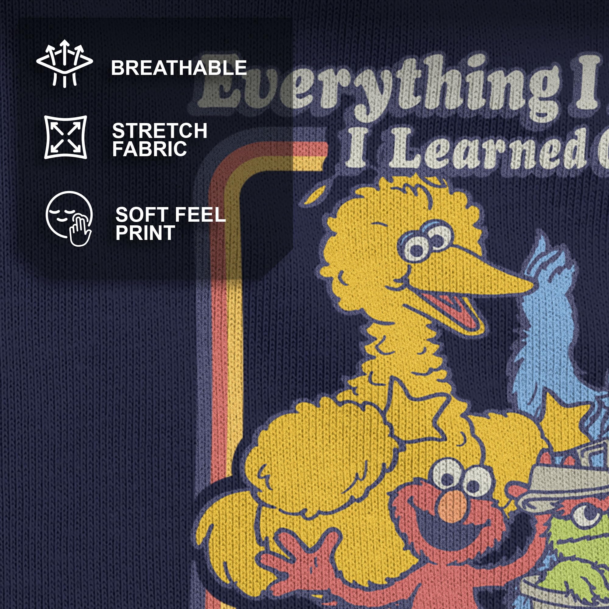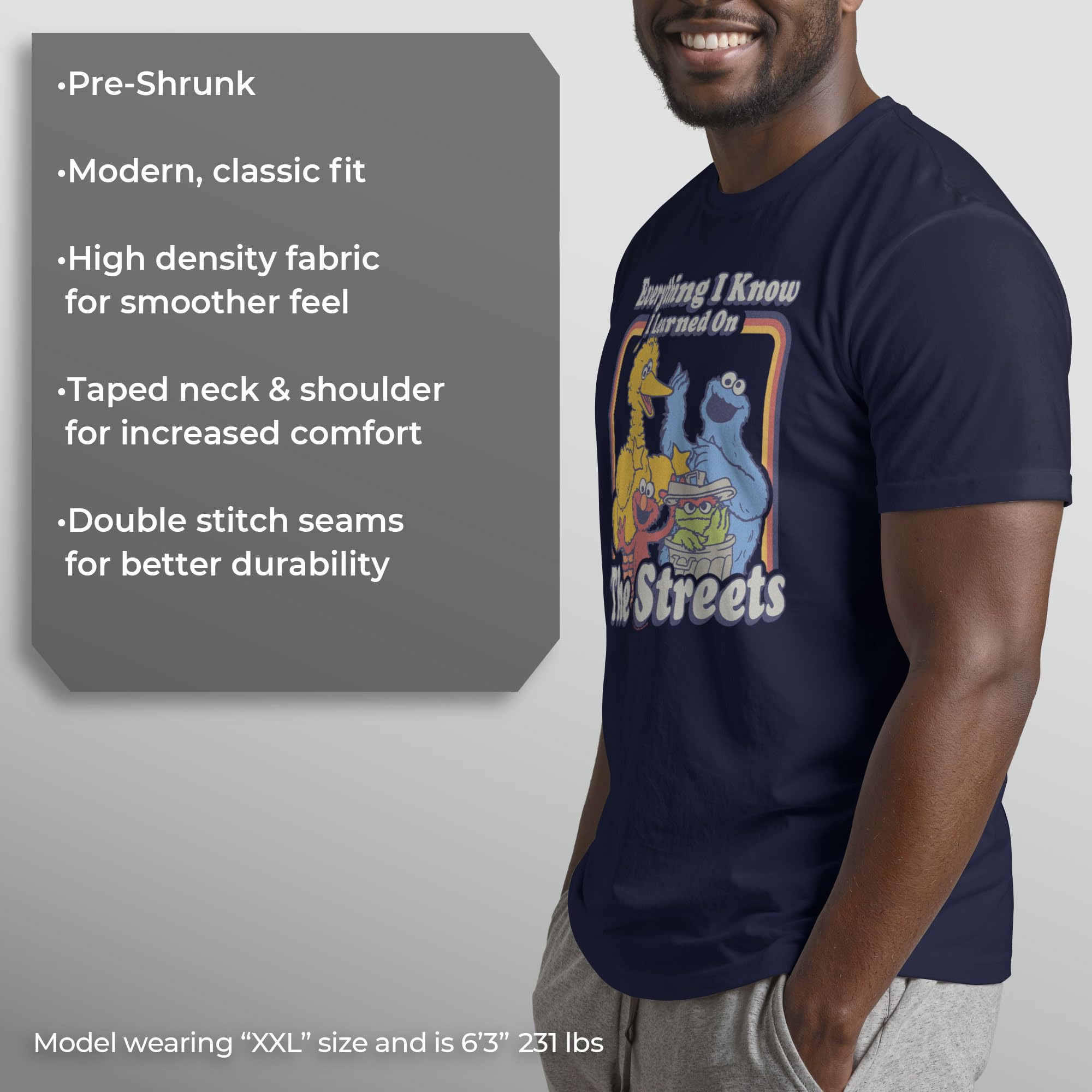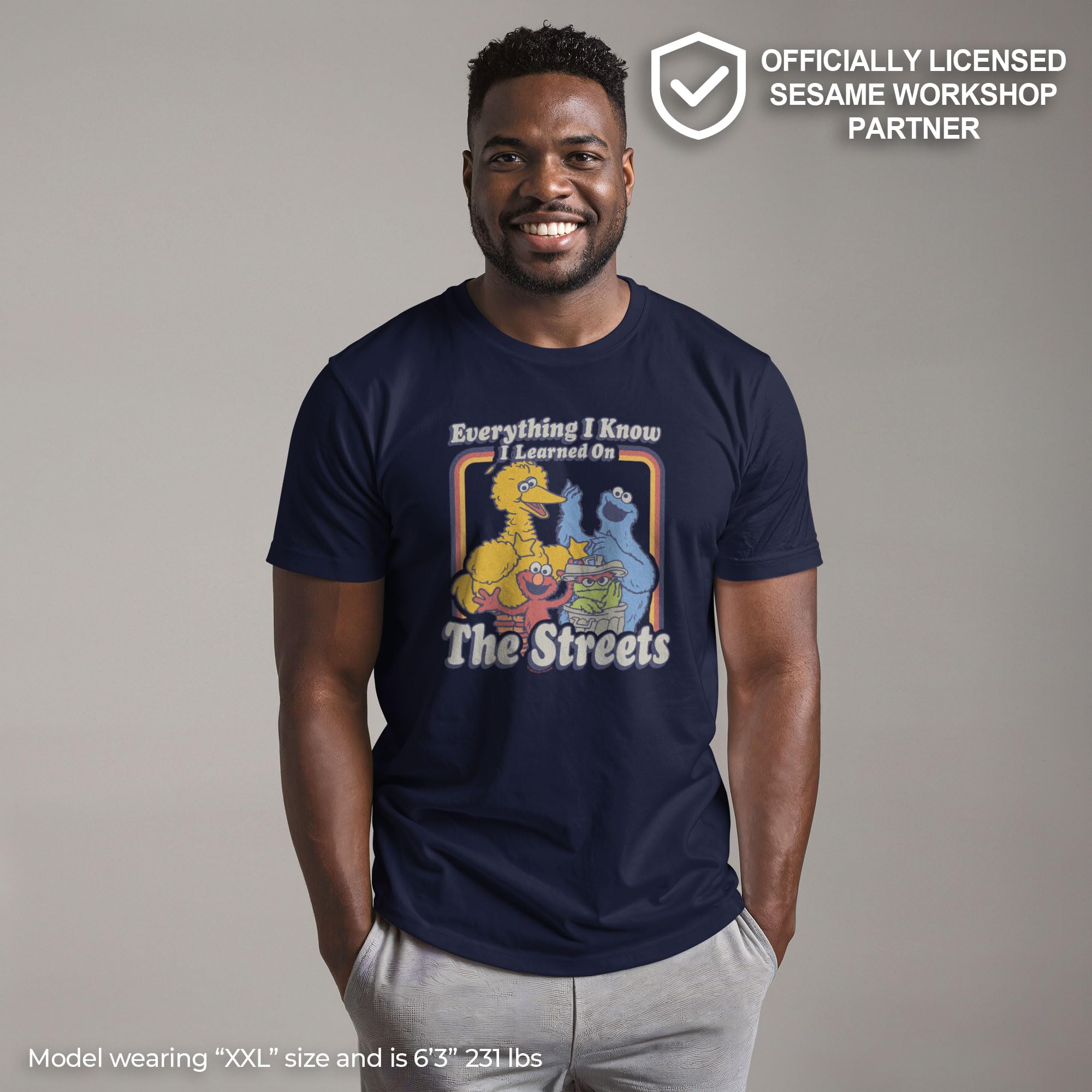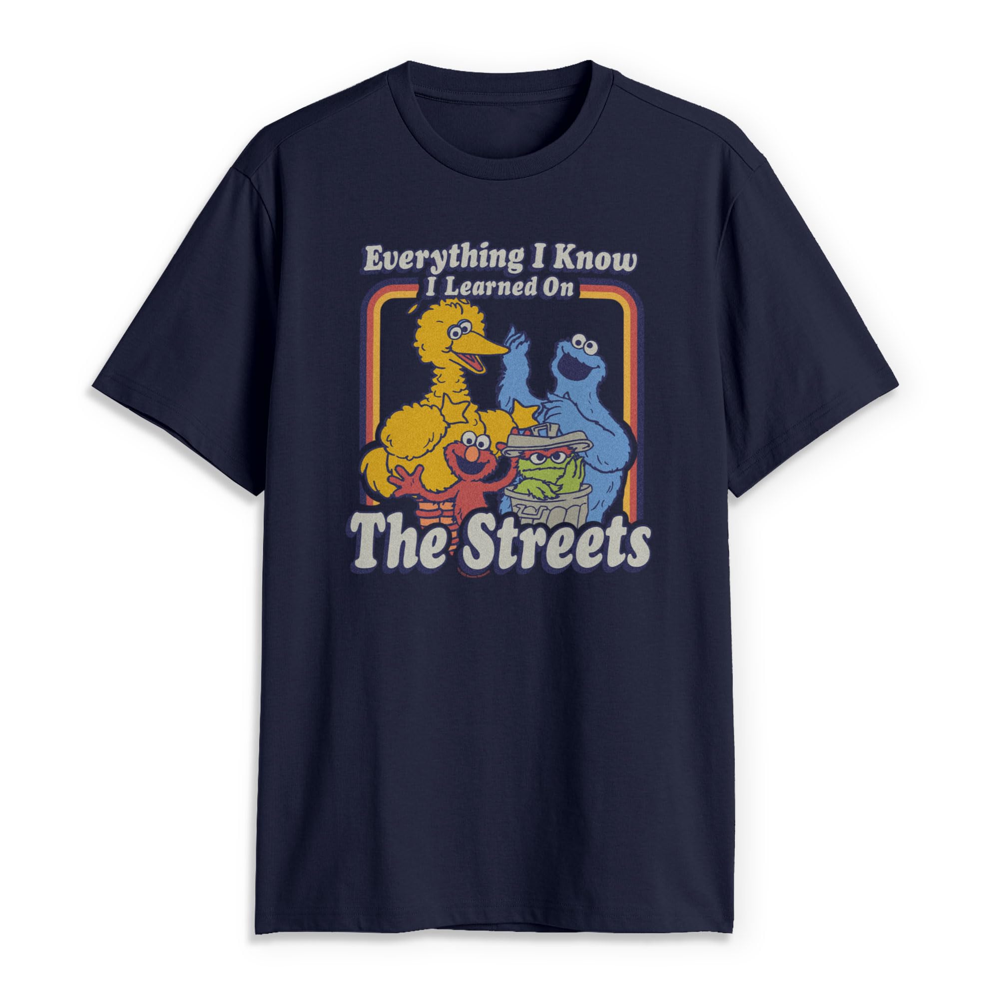 Head out onto the streets in style with this vintage men's t-shirt that is perfect for every occasion! Featuring Big Bird, Cookie Monster, Elmo, and Oscar the Grouch with the text: "Everything I Know I Learned on the Streets," across the front.