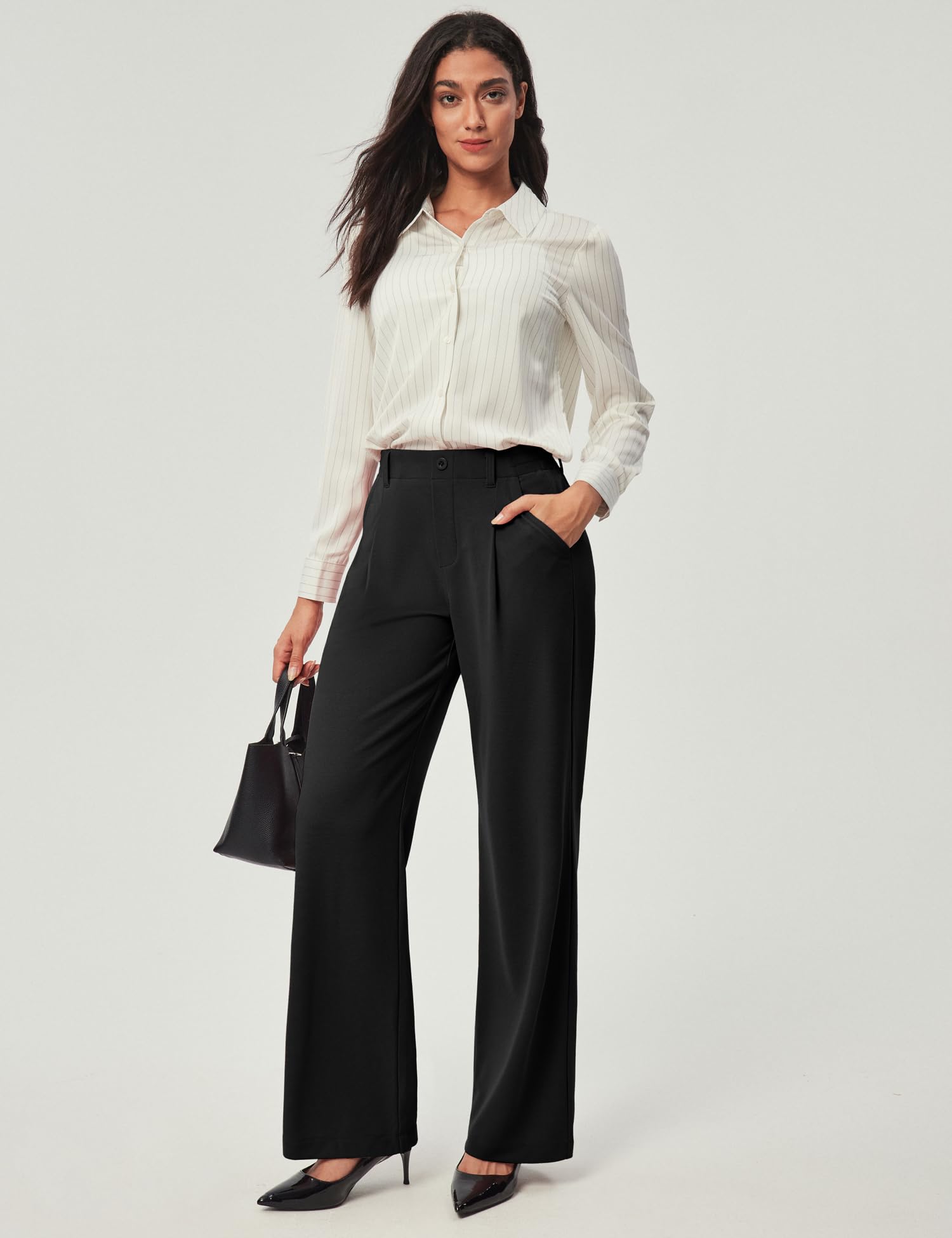 Chic and Practical Design: The work pants women feature stylish pleats that add texture and depth, creating a fashionable look. Two functional side pockets offer convenient storage for small items, boosting their practicality for everyday wear.