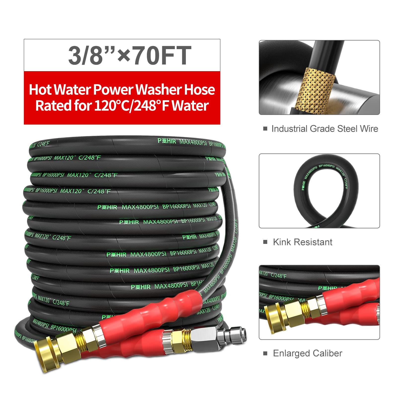 【POHIR Power Washing Hose】The hot water hose 70ft is perfect hose extension, it's durable and able to support quite high working pressure. Inner tube is reinforced with synthetic rubber. Reasonable selection of 3/8"" inner diameter greatly reduces the weight and volume of the hose body, making it more convenient to use and storage. Its innovative high-tech materials and processes can extend the service life and are safe to use, suitable for household cleaning & commercial use.