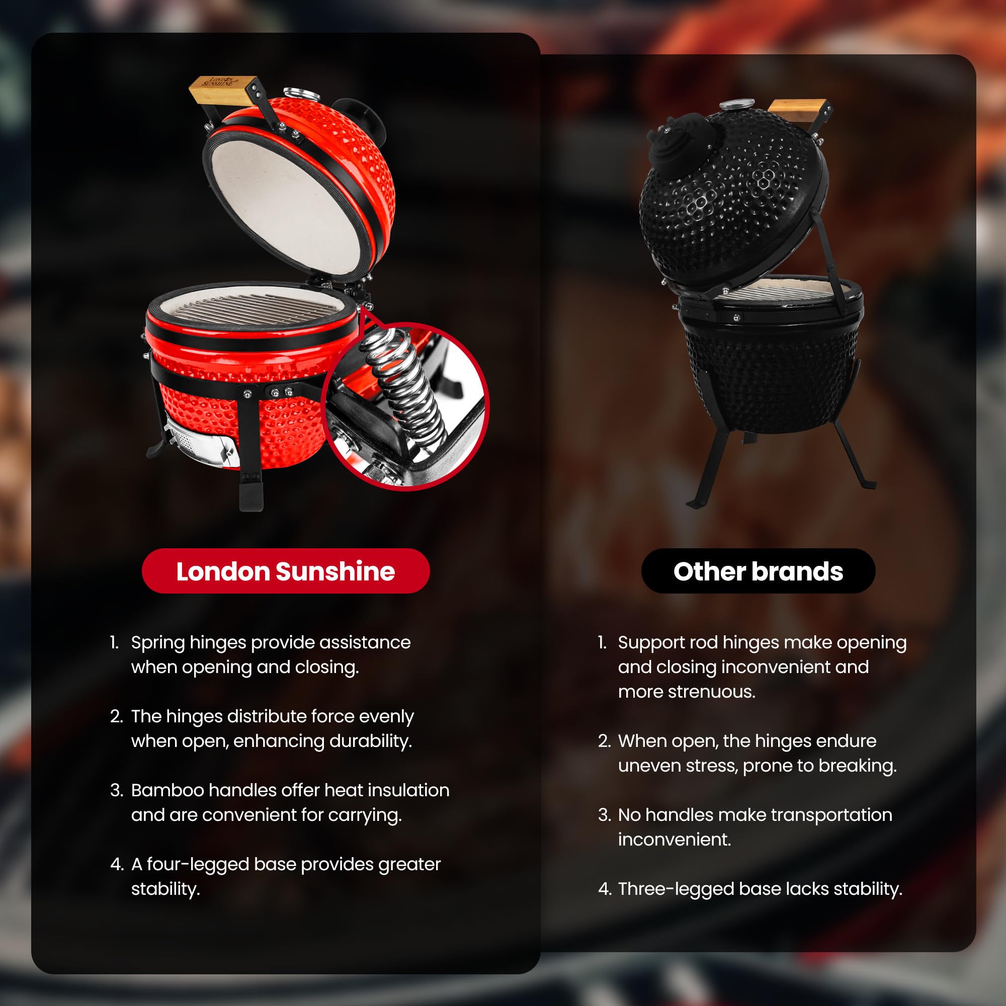 LONDON SUNSHINE CERAMIC KAMADO CHARCOAL BBQ GRILL - Mini Cadet Series 13" with New Waterproof Air Vent Experience the ultimate outdoor cooking with the Mini Cadet Series Kamado Grill. Perfectly sized for small families and intimate gatherings, this grill offers unparalleled temperature control and versatility. Its thick ceramic construction ensures superior heat retention, locking in moisture and flavor for juicy, tender results every time. Plus, the newly upgraded waterproof air vent guarantees consistent performance in any weather, making it a reliable choice for year-round grilling. Product Specifications: Main Ceramic Body Diameter: 13" (33 cm) Cooking Grid Size: 10.8" (27.5 cm) Assembled Dimensions (LΓWΓH): 13.8" Γ 16" Γ 21.6" (35 Γ 40.5 Γ 55 cm) Operation Height: 13.6" (34.5 cm) Net Weight: 43.4 lbs (19.7 kg) Gross Weight: 48.7 lbs (22.1 kg) Package Size: 18.1" Γ 16.9" Γ 20.1" (46 Γ 43 Γ 51 cm) New Upgrade: Waterproof Air Vent (ensures precise heat control even in rainy conditions) WHY CHOOSE THE KAMADO GRILL? SUPERIOR TASTE Why does the Kamado BBQ make food taste better? The thick ceramic walls excel at heat retention, trapping moisture, spices, and natural charcoal flavors inside. This creates an even cooking environment that produces exceptionally juicy and tender results. In contrast, traditional metal grills radiate heat unevenly and often drain moisture from food, leaving meat tough and lacking that authentic smoky charcoal flavor. MULTI-FUNCTION COOKING This Kamado BBQ Grill empowers you to smoke, bake, roast, BBQ, and broil with ease. By simply adjusting the airflow and choosing between direct or indirect heat, you can explore a wide range of culinary techniques. With an extensive temperature range of 82Β°C to 399Β°C (180Β°F to 750Β°F), this grill is capable of handling everything from low-and-slow smoked meats to perfectly seared steaks. EFFICIENT AND ECONOMICAL Crafted as a long-lasting masterpiece, the Kamado Grill elevates your backyard cooking experience while saving you money over time. Unlike conventional steel smokers that require frequent replacement, this ceramic grill is built to endure. It also reduces charcoal consumption by 50%β75%, making it an eco-friendly and cost-effective choice. ALL-WEATHER PERFORMANCE With the new waterproof air vent, this grill maintains consistent temperatures and optimal airflow, rain or shine. No more worrying about sudden weather changes interrupting your grilling session. This upgrade ensures you achieve perfect results every time, regardless of the conditions.