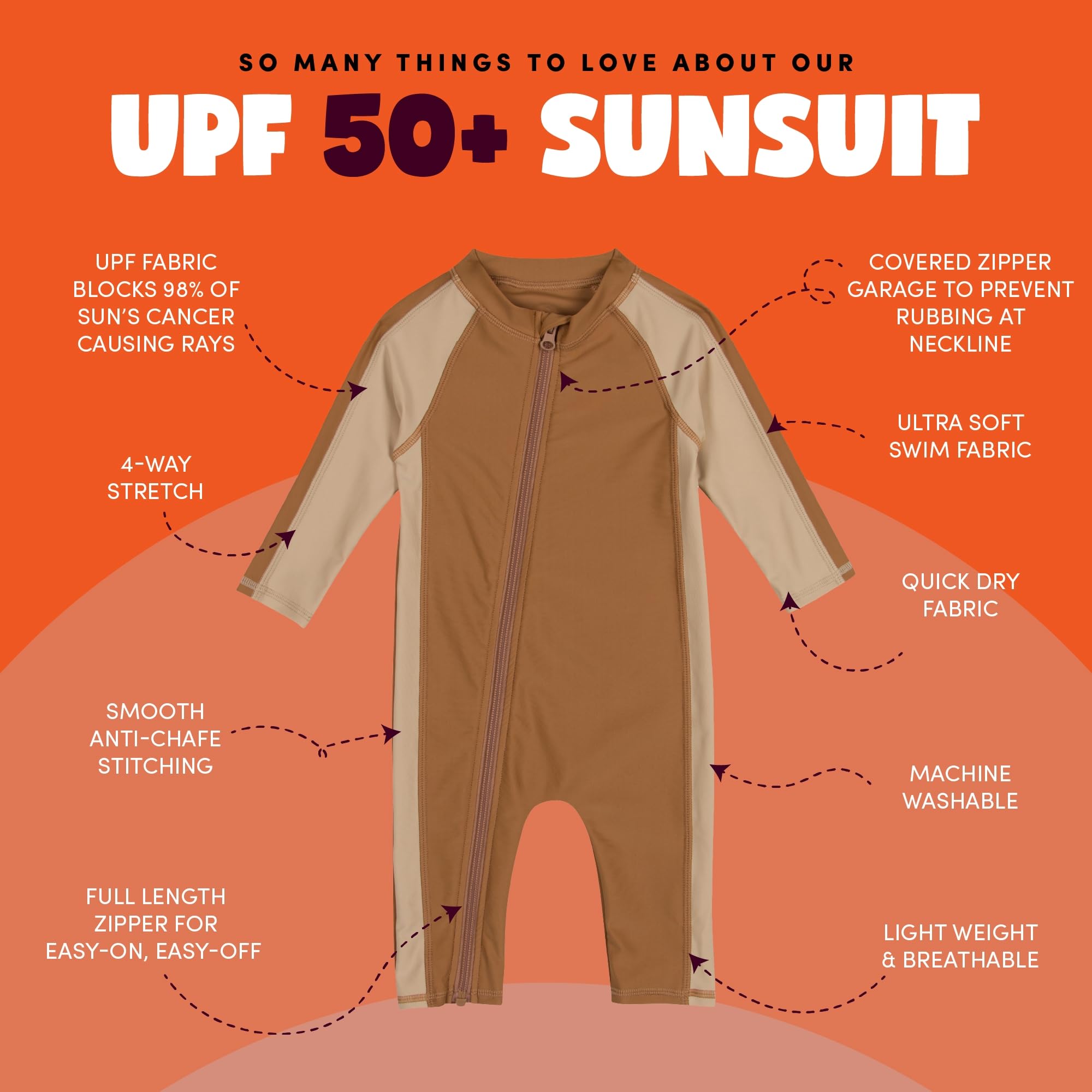 TOTAL SUN PROTECTION: SwimZip's famous sunsuit offers full-length sleeves and leg coverage to block the sun's harmful rays from the skin of baby boys (up to little boys age 6). Cover up instead of lathering up with chemical suncreens! Our sunsuits are made from our signature UPF 50+ (SPF 50+) rash guard material, which blocks out 98% of the sun's harsh UVA and UVB rays. It's saltwater- and chlorine-resistant, quick drying, breathable, and offers 4-way stretch!