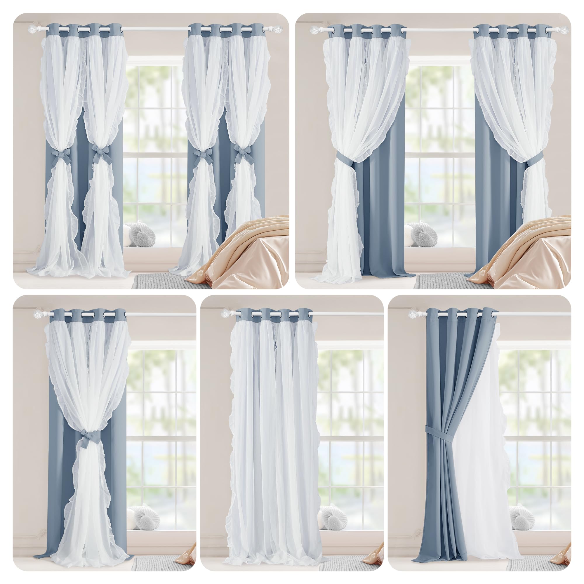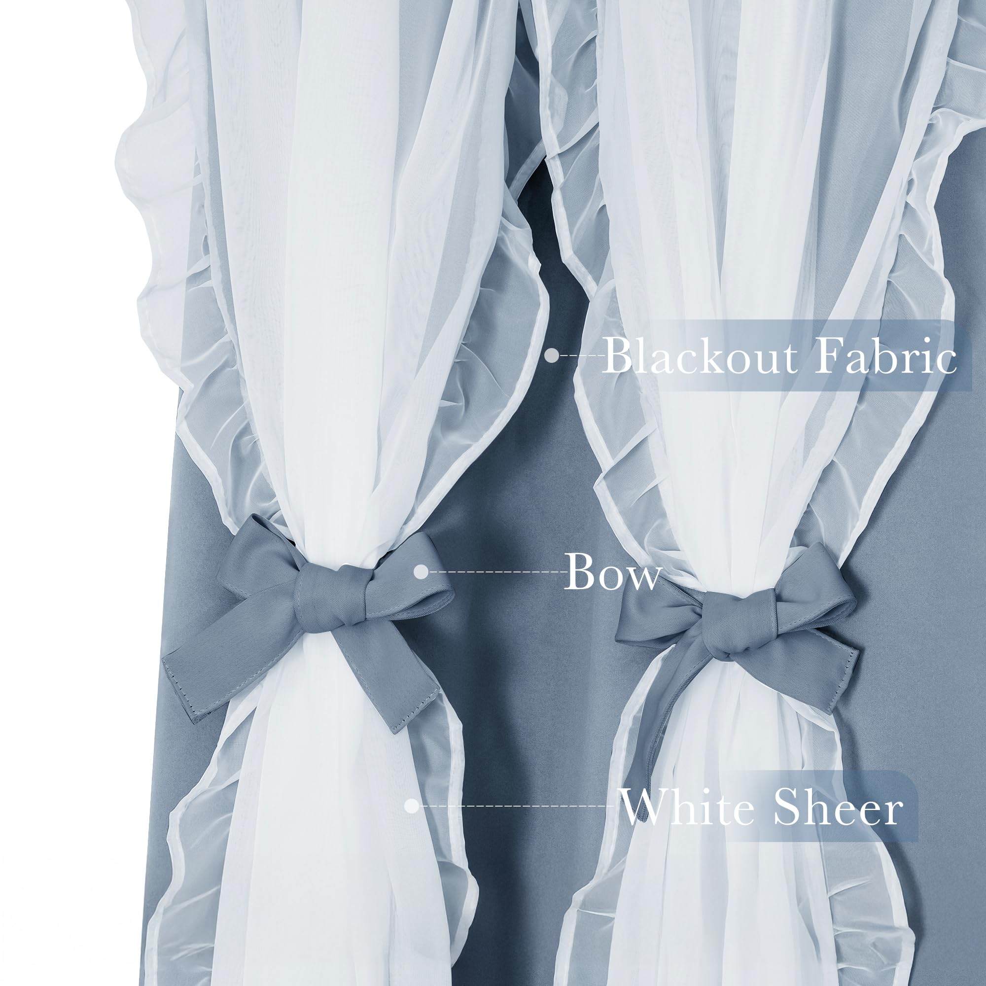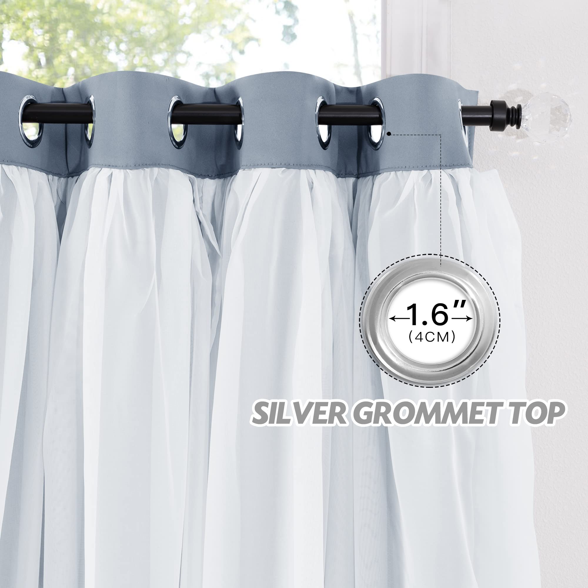 Double Layers: Made of 100% polyester fabric, block out a fair amount of light & heat while adding privacy. The white sheer panel bring an elegant and luxurious feeling