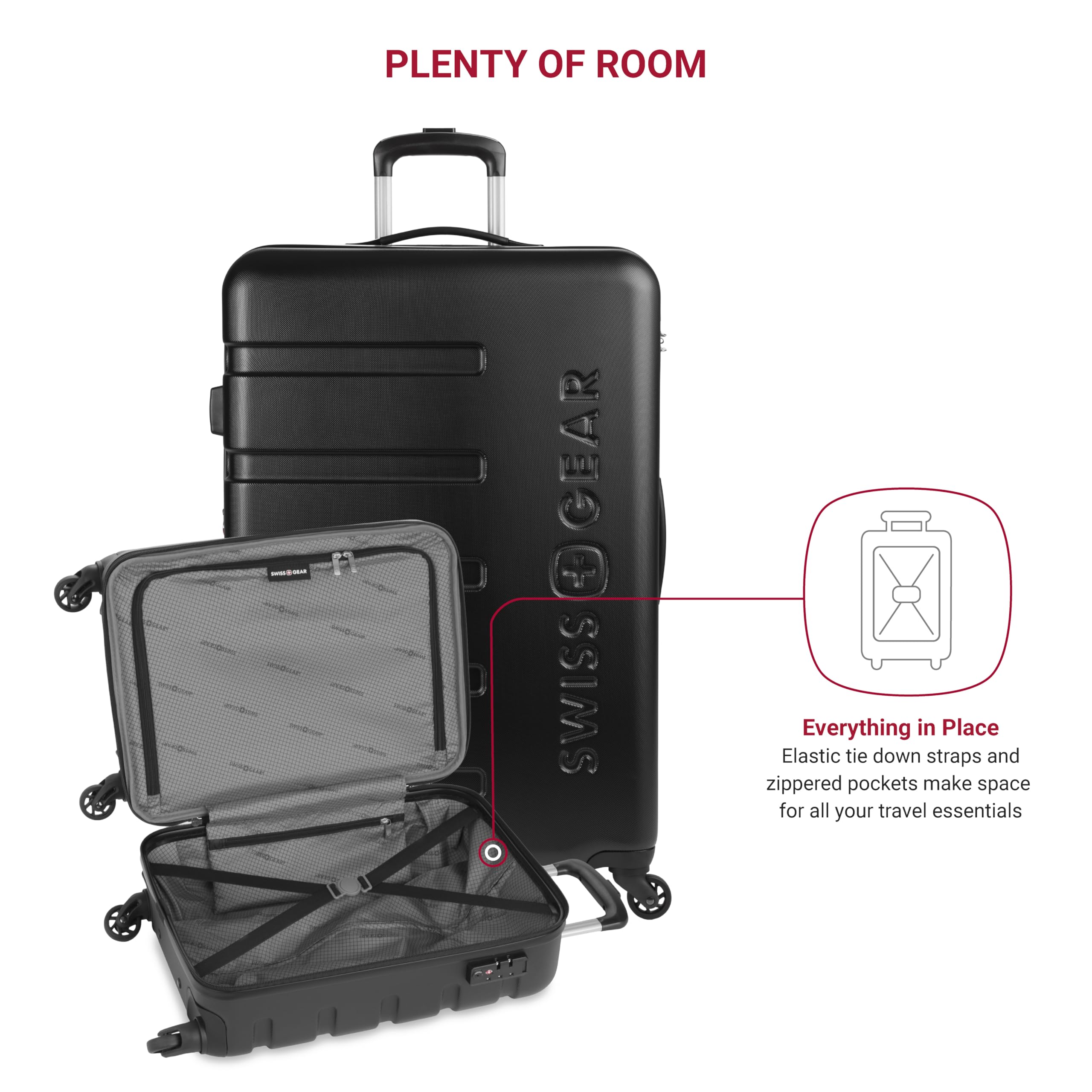 Description Travel in style with the SwissGear Signature Expandable Hardside Luggage Set. Both modern and utilitarian, its lustrous metal zippers and rugged construction exemplify its long-lasting quality. The set contains the 19” Carry-On and a 27" Expandable Hardside Luggage. Its almost indestructible split case opens to display the main compartment equipped with tie-down clothing straps, a roomy zippered lid pocket, and a large zippered packing pocket to keep your travel-sized essentials separate from your clothes. It also includes a premium steel locking handle, four 360-degree wheels, expandable packing space, and a molded grab handle. Guaranteeing extra security with its built-in TSA-approved three-dial combination lock, make this a go-to for your upcoming voyage because, whether traveling for business or pleasure, this is doing adventure the right way.