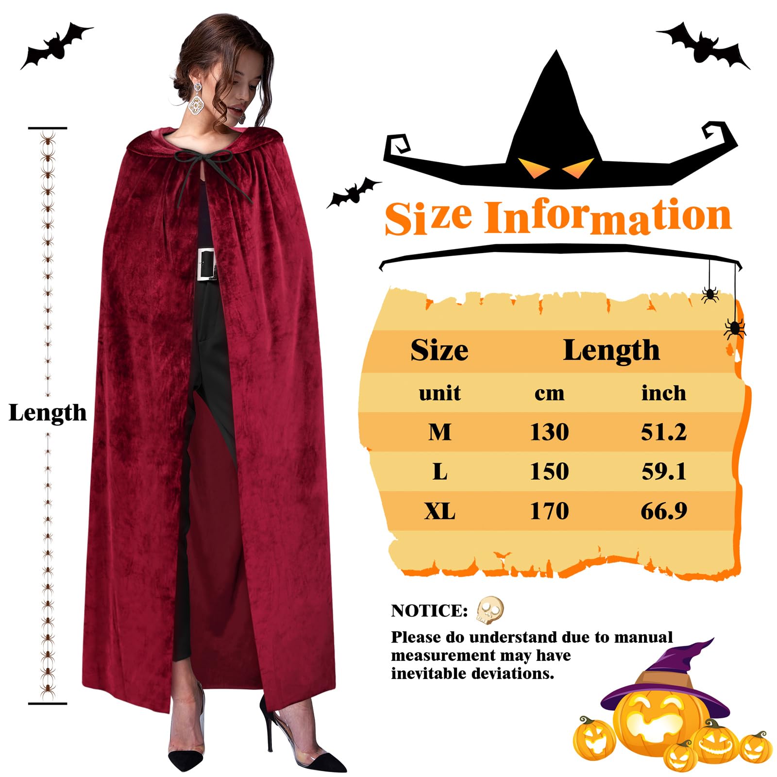 SIZE INFORMATION: Our adult halloween costumes have 3 sizes. The Size Medium is approximately 51.2 inches from shoulder to hem, the Size Large is approximately 59.1 inches from shoulder to hem and the Plus Size X-Large is approximately 66.9 inches from shoulder to hem. Please attention this length does not include the hood. These 3 sizes are suitable for most people, please select according to size data.