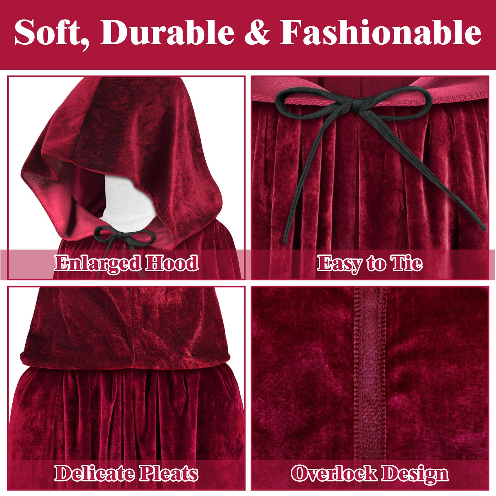 IDEAL HALLOWEEN COSTUMES: The velvet cape with hood is the perfect choice for Halloween role playing! The black hooded cape can be used as an ideal witch cloak, vampire cloak, wizard cloak and so on. And the red cloak is also suitbale for Christmas! And we also have purple cloak, green cloak, various colors are available to meet different role-playing needs.