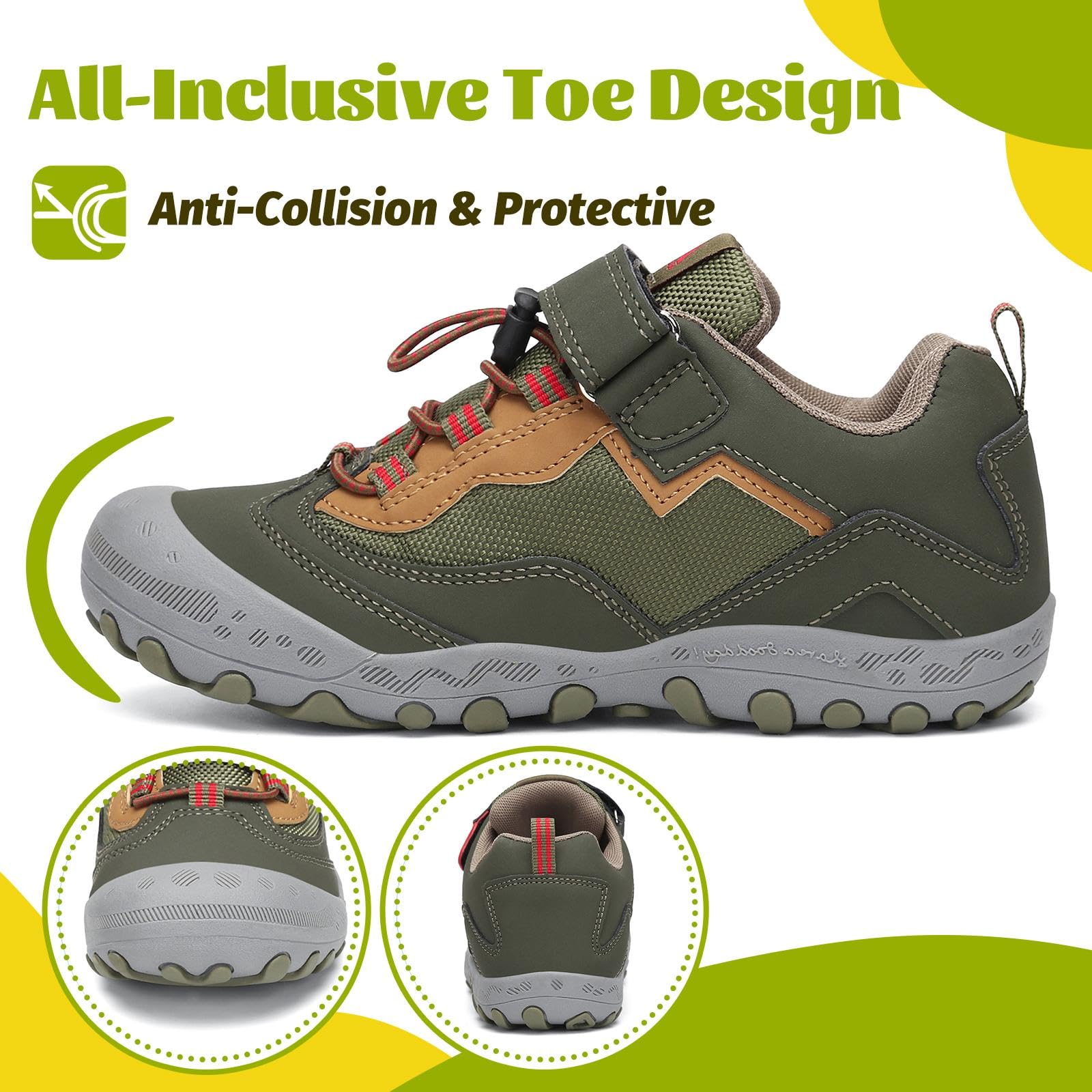 Protective Toe Design: Girls hiking shoes are designed with a reinforced anti-collision toe cap, protection against rocks, roots, and other obstacles. This feature of boys hiking shoes ensures that kid can move confidently without worrying about injuries, making them ideal for outdoor adventures