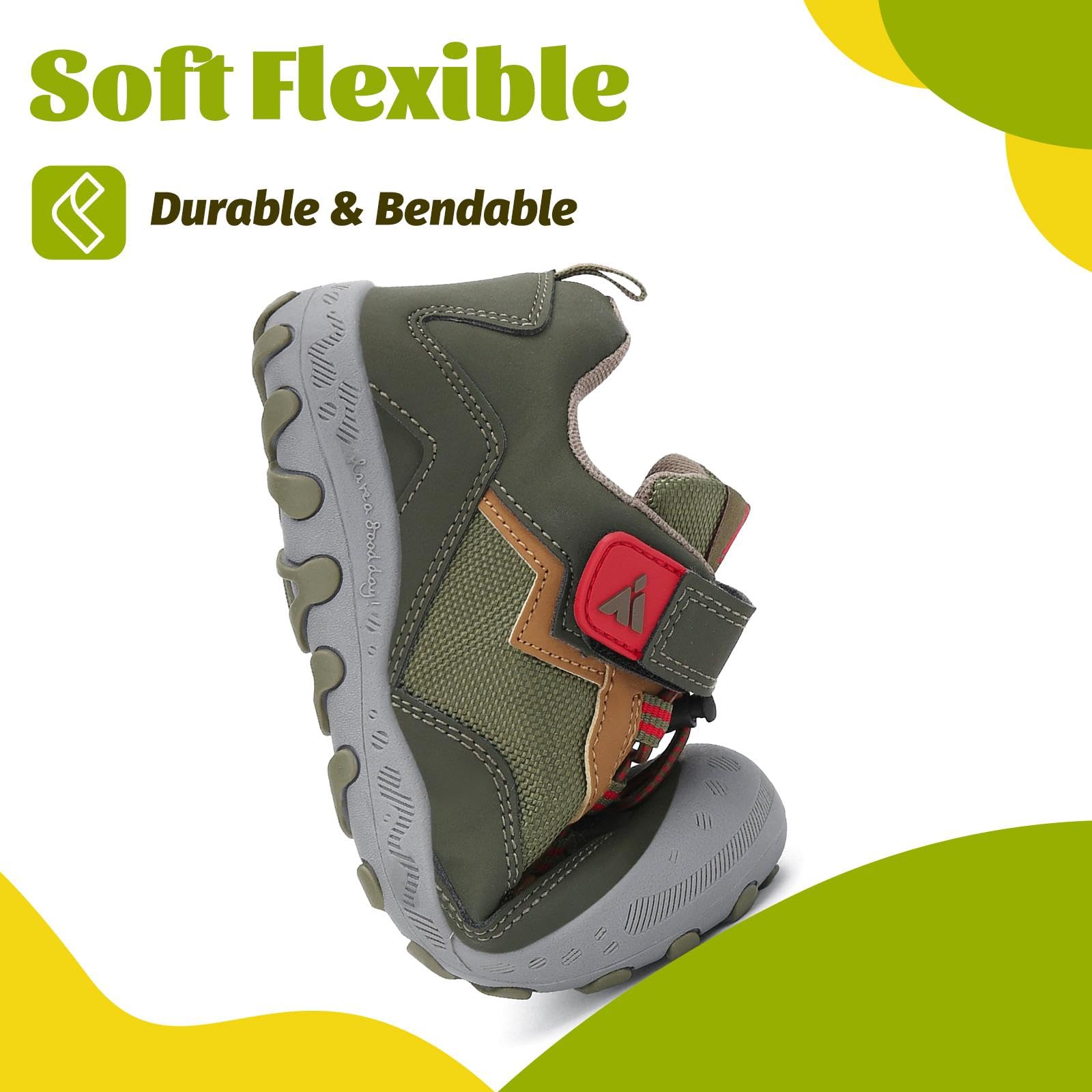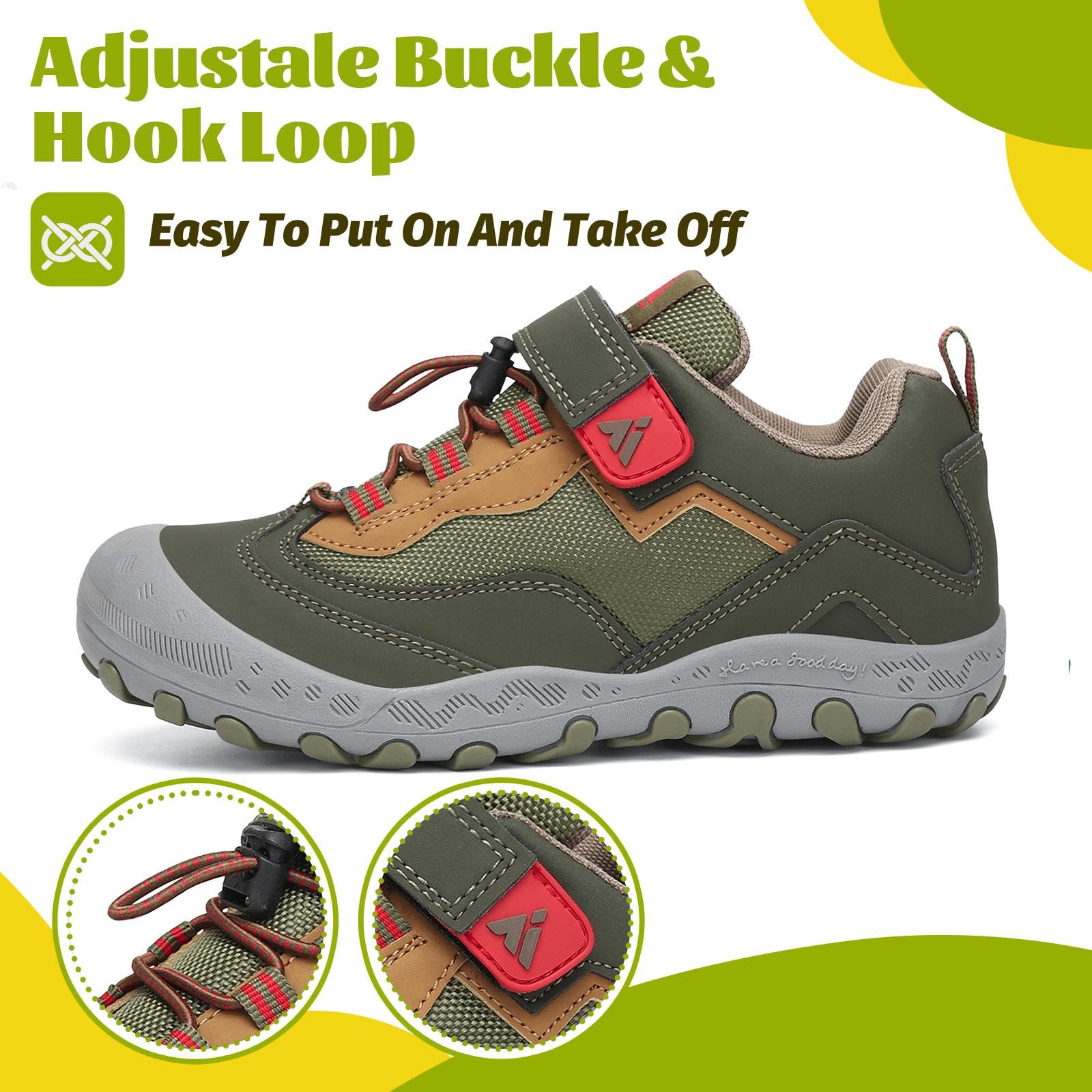 Adjustable Closure: Toddler hiking shoes are featuring adjustable buckle closure make it easy for kids to put on or take off by themselves and keeps the kids hiking sneakers snugly in place during activities