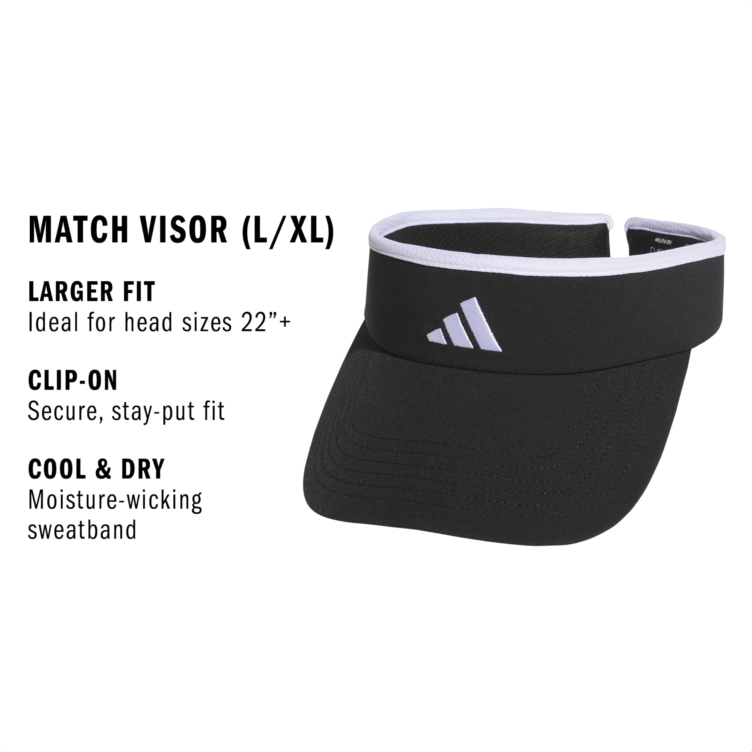 Description Keep glare and hair out of your eyes wearing this women's adidas Match 2 Visor. Its lightweight, one-size-fits-all design provides full brim coverage for the court, the beach or wherever. Sweat-wicking material keeps you dry through game, set and match.