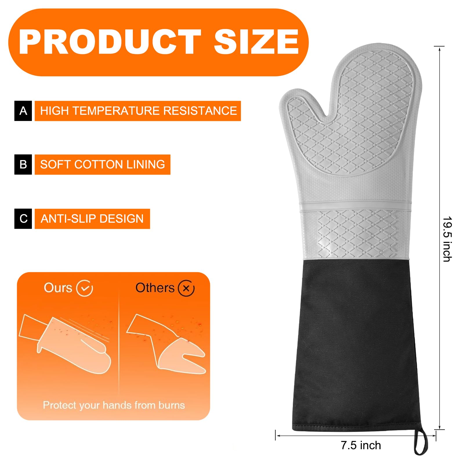 GET A BETTER GRIP: the best oven mitts pair; constructed of durable silicone, oven mitts are naturally slip resistant, helping you to get the best grip while you cook; unique textured honeycomb pattern helps you hold tight to pans, pots and baking sheets without hindering your natural grip