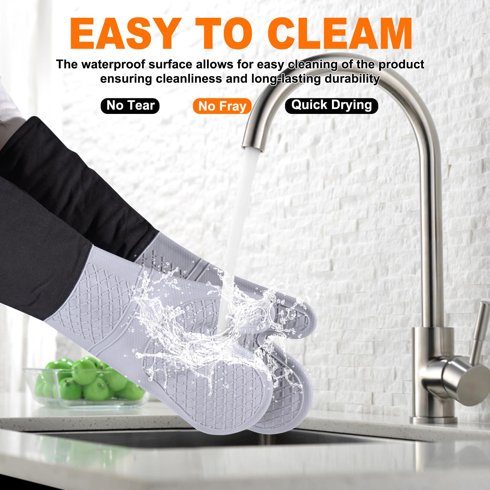 Easy to Clean & Waterproof: The oven mitts are easy to clean. If you get any food on them while wearing, just gently swish around in soapy water or just wipe them clean. You can hang it up with the nice hanging hook in the cuffs. The silicone part is totally waterproof.