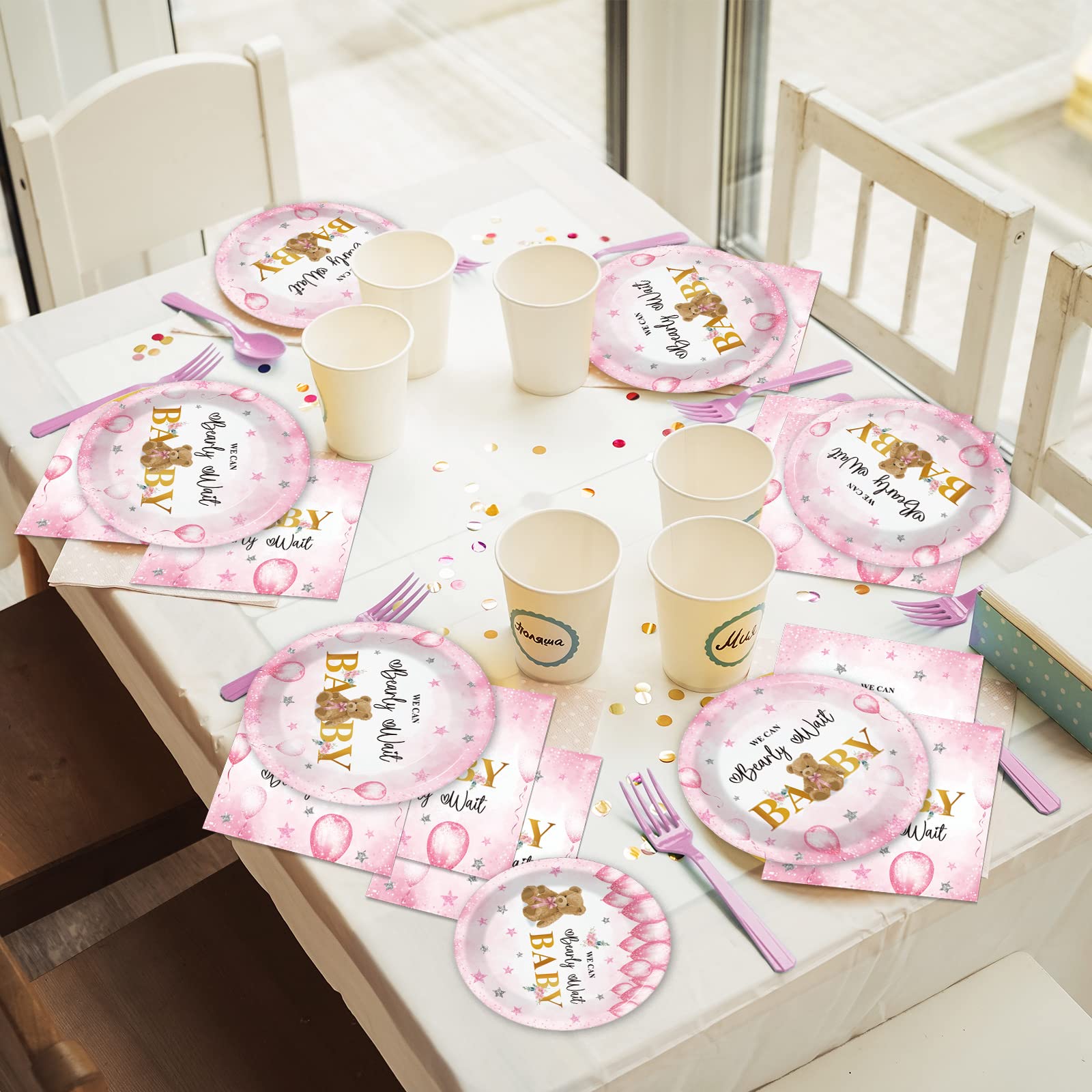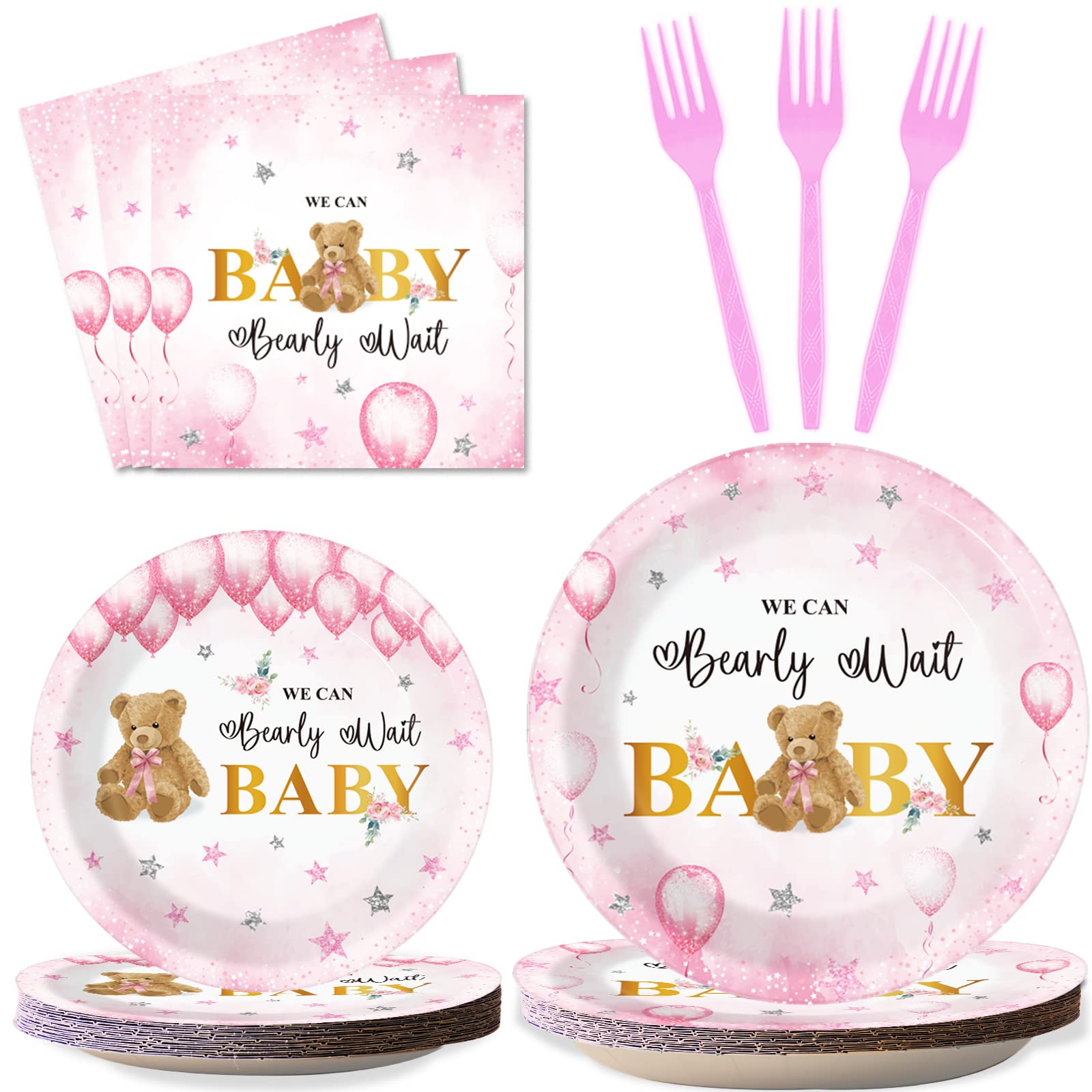 What's in the package: You'll receive 24 9" bear party paper plates, 24 7" bear paper plates, 24 6.5" bear napkin replacers, and 24 plastic pink forks, each set serves 24 people guests