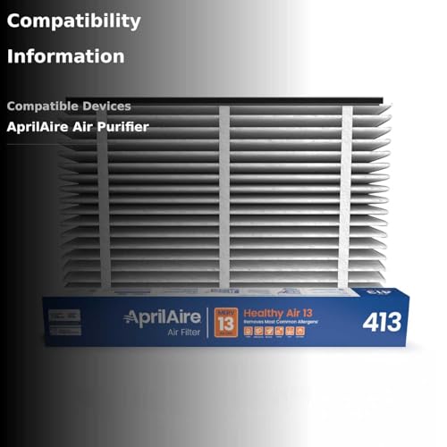 A small change can make a big difference in your home environment. AprilAire delivers that difference with the 413 Healthy Air 13 Filter. The 413 replacement whole-home filter traps and removes the most common allergens including airborne pollen, mold spores, bacteria, pet dander, dust particles, and dust mites as air circulates through the MERV 13 filter. Discover a healthier home environment with the AprilAire 413 Healthy Air 13. Your HVAC system is protected from airborne particles too, which helps lower your energy costs, and can prolong the life of your equipment. Lengthen your HVAC system's life and improve your home's energy-efficiency by reducing dust buildup. Genuine AprilAire filters are specifically engineered to work with your AprilAire air cleaner and come with the Pure Fit Promise ensuring that the filter will fit your AprilAire air purifier equipment exactly. Efficient home and system protection - extremely low initial resistance and high dust holding capacity support up to 12 month filter life, saving you time on furnace filter changes compared to traditional 1-3 month filters. AprilAire 4-inch filters provide superior filter area (24.5 square feet of filtering media) for harmful particles to be captured compared to common 1-inch filters. The patented Self-Seal Technology assures no air will pass by unfiltered, keeping your home clean and HVAC system operating at peak performance. The AprilAire 413 Healthy Air 13 Filter has a nominal air filter size of 16 x 25 x 4 inches and is compatible with AprilAire Air Cleaner Models 1410, 1610, 2140, 2400, 2410, 2416, 3410, 4400, or Space-Gard 2400 with Upgrade Kit 1413. The AprilAire Patented Interlock Rail System means no assembly required - easy and quick three-step filter replacement process. Illustrated packaging includes detailed air filter replacement instructions. Designed and made in the USA and backed by the AprilAire Clean Coil Commitment. Note: MERV is a scale used to measure the effectiveness of air filters. Higher number values translate to more effective filtration. *Performance tested to ASHRAE 52.2 Standard, minimum efficiency reporting value – MERV 13. Contaminants removed based on air passing through the filtering system.