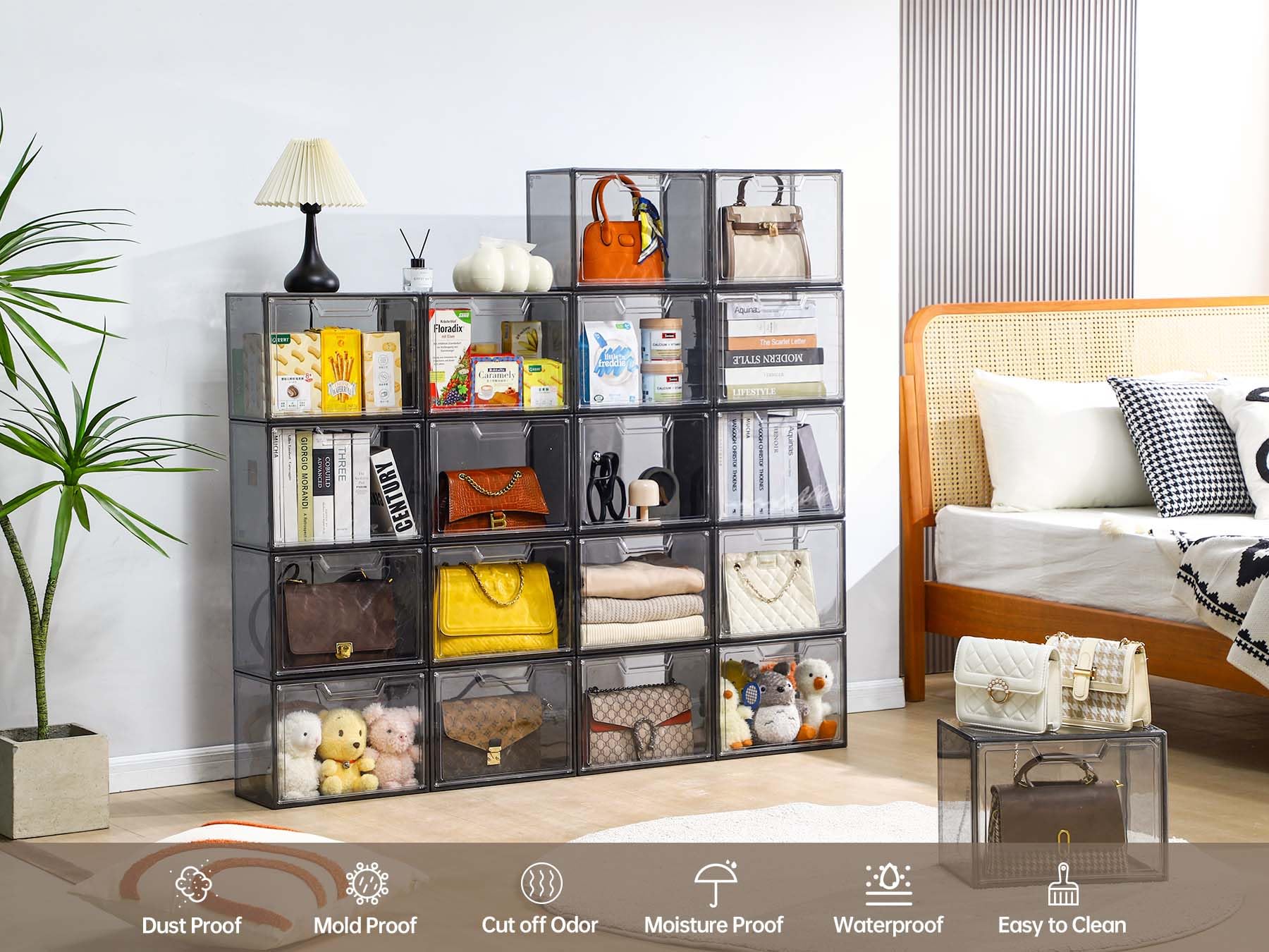 STURDY & STACKABLE STORAGE BINS - Made of hard acrylic to ensure stability, thickness up to 6mm, smooth surface and rounded corner makes it very comfortable to touch. Featuring a slot design, these 5 Pack clear display cases allow you to help maximize your space, stack and store your handbags to suit your space and personal preference.