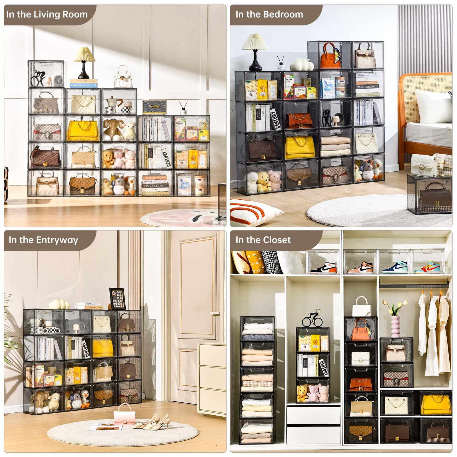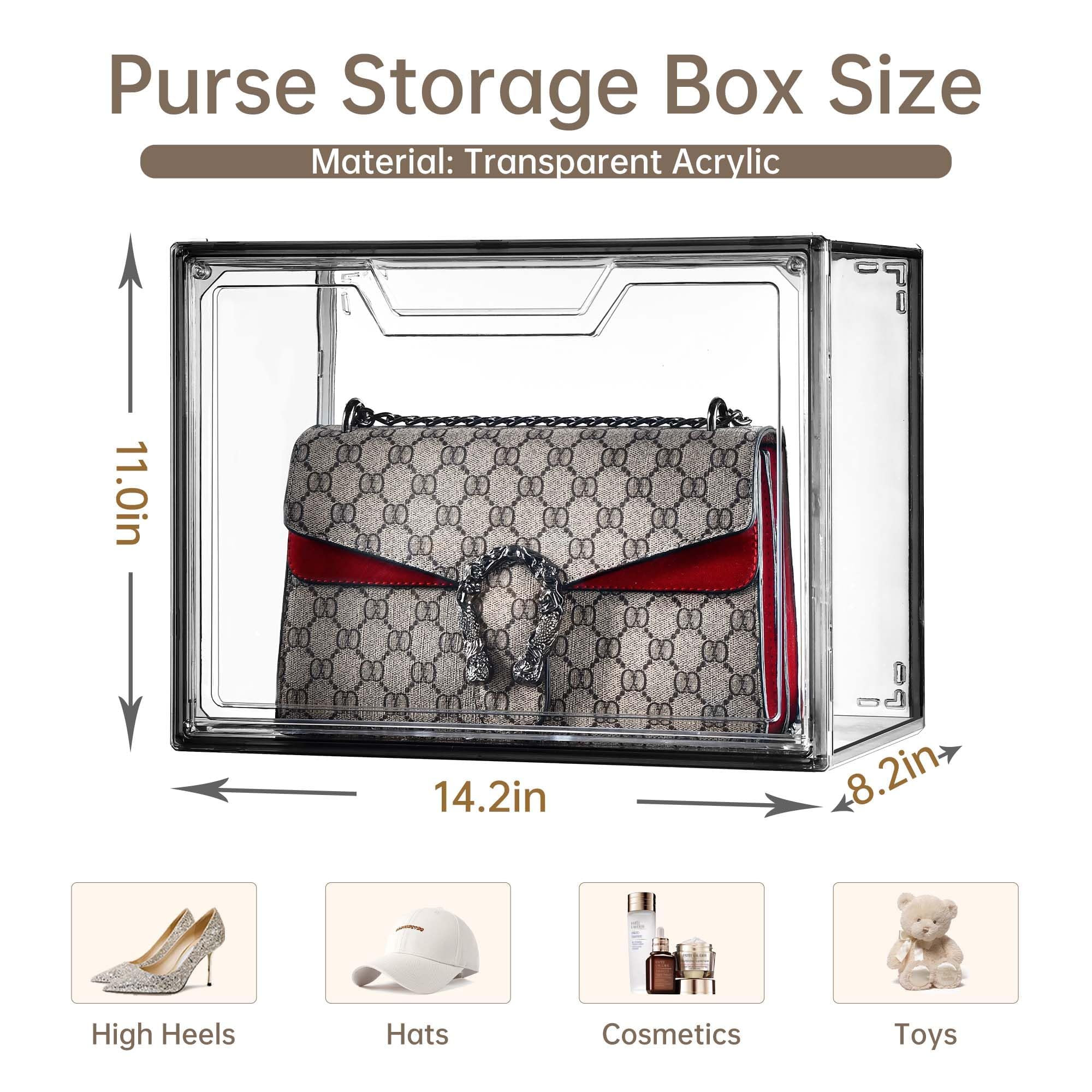 HIGH TRANSPARENCY & MAGNETIC DOOR DESIGN - The handbag storage organizer provided 360 clear view of your favorite bags, all-round perspective display. With magnetic door, easy to open and close the purse containers, find the right shoes in seconds without opening all box, save your time, stylish and elegant.