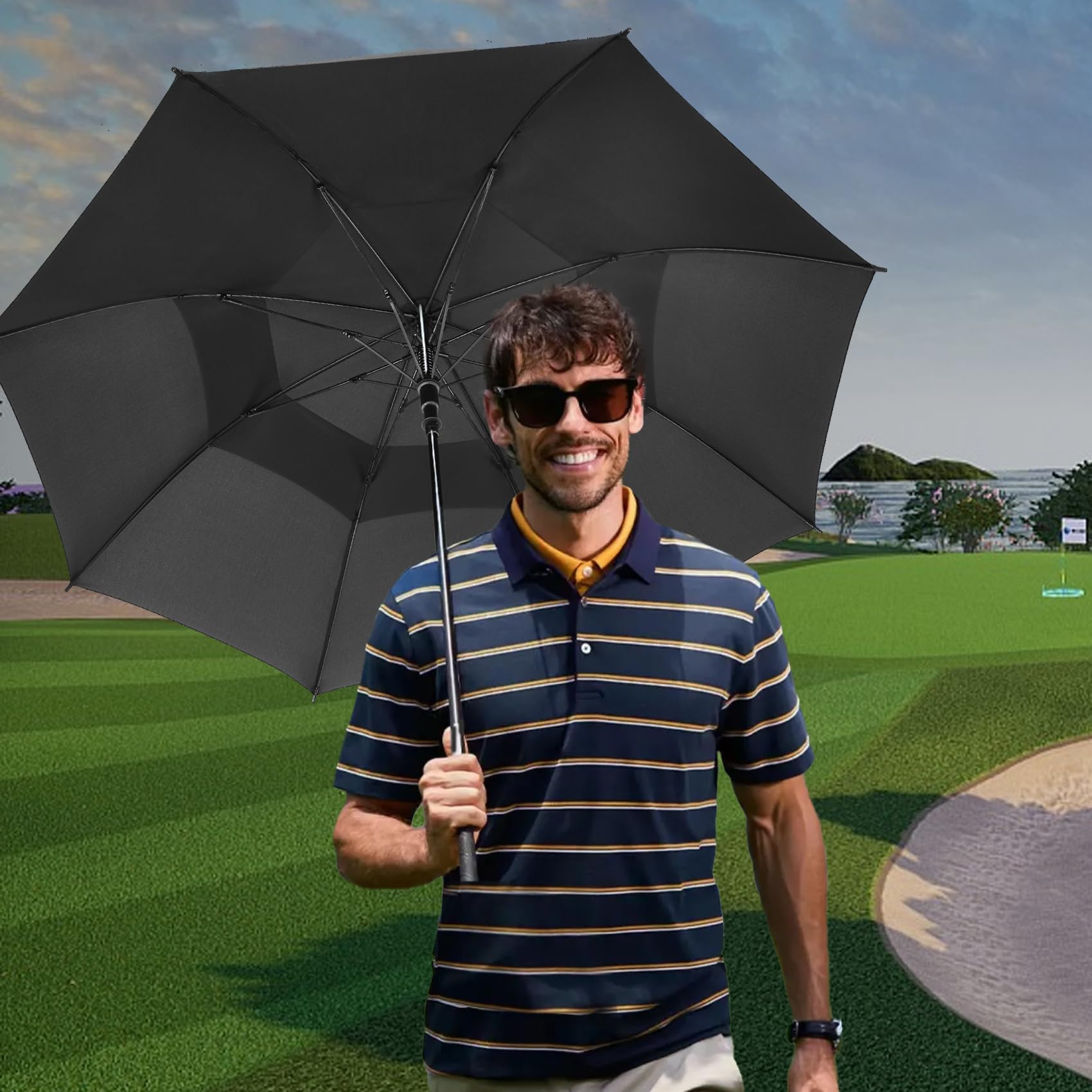 ☂️WINDPROOF GOLF UMBRELLA: The double-canopy design and fiberglass frame will ensure that your umbrella is VIRTUALLY WINDPROOF. Wind will simply not break it. The double-canopy design creates a vent during where wind can pass through, making the umbrella much easier to handle in harsh conditions.