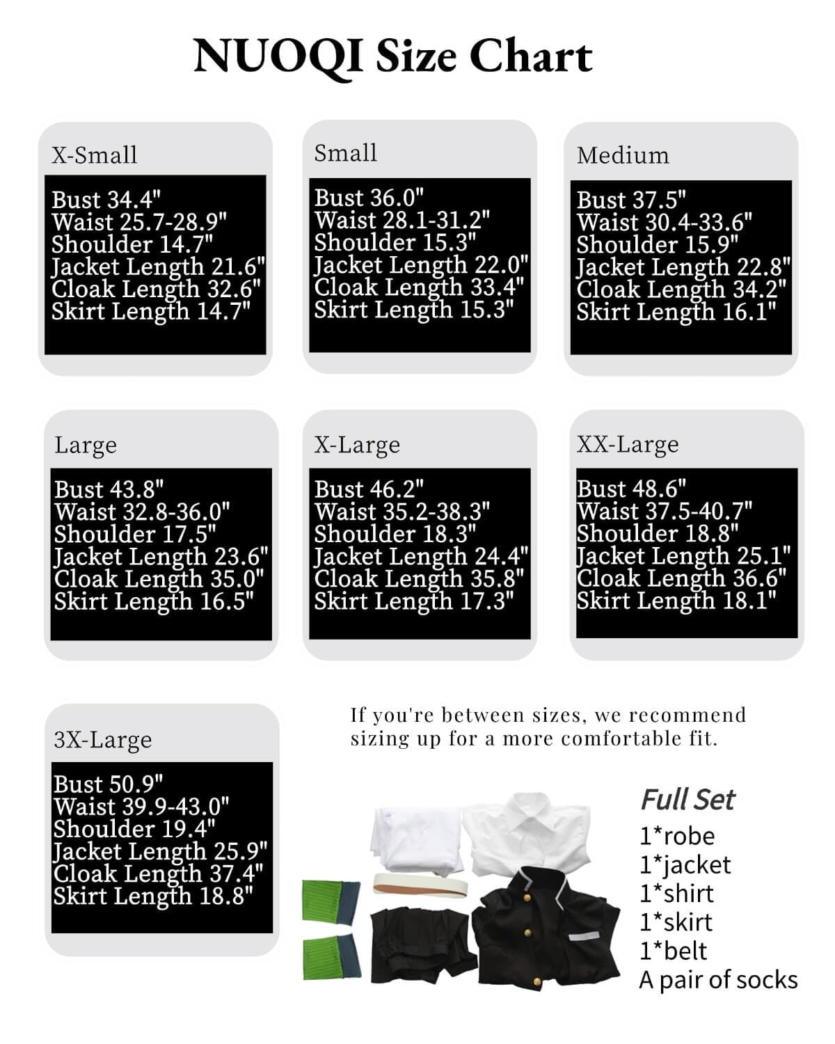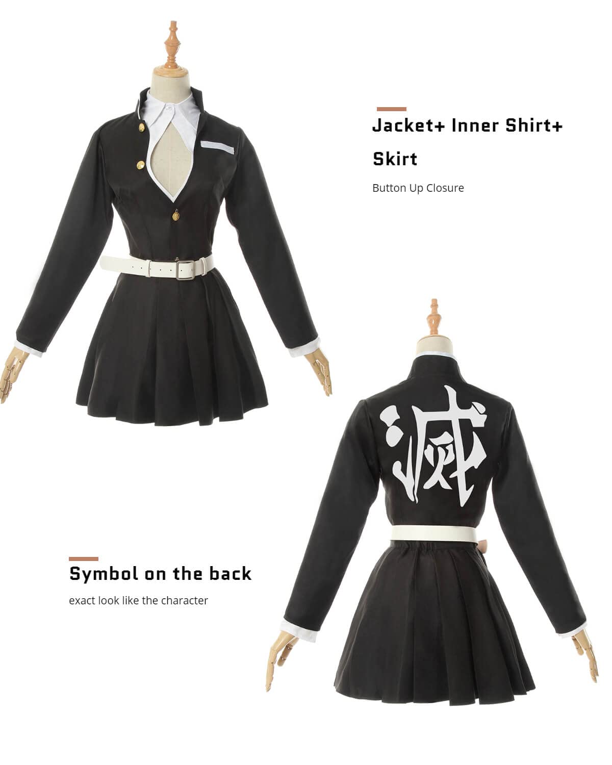 Mitsuri Costume Uniform Full Set Included - 1*white kimono robe, 1*black jacket, 1*button up shirt, 1* black skirt,1*belt and a pair of socks. There is a classic symbol on the back of the jacket. The skirt with button and zipper closure on the side, elastic on the waist. And come with socks that can be worn with sandals. Perfect girls mitsuri kanroji cosplay indoor or outdoor.