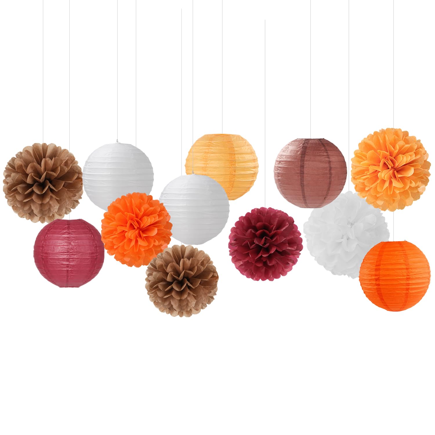 【Brown Burgundy Orange Party Decorations Kit Includes】The party decorations kits include 9pcs tissue paper flowers: 6pcs 10" and 3pcs 8" in brown burgundy orange color, 6pcs 8inch paper lanterns.