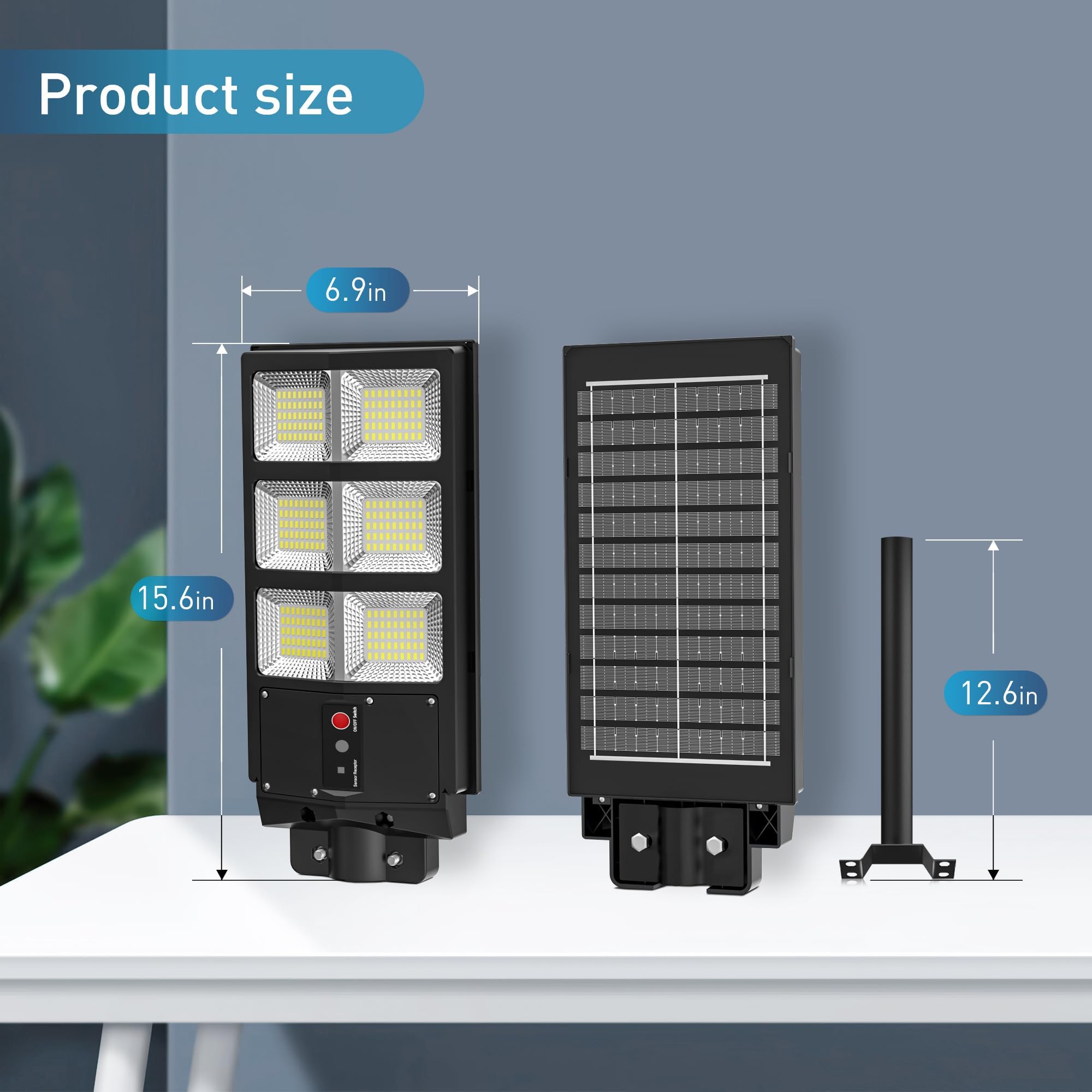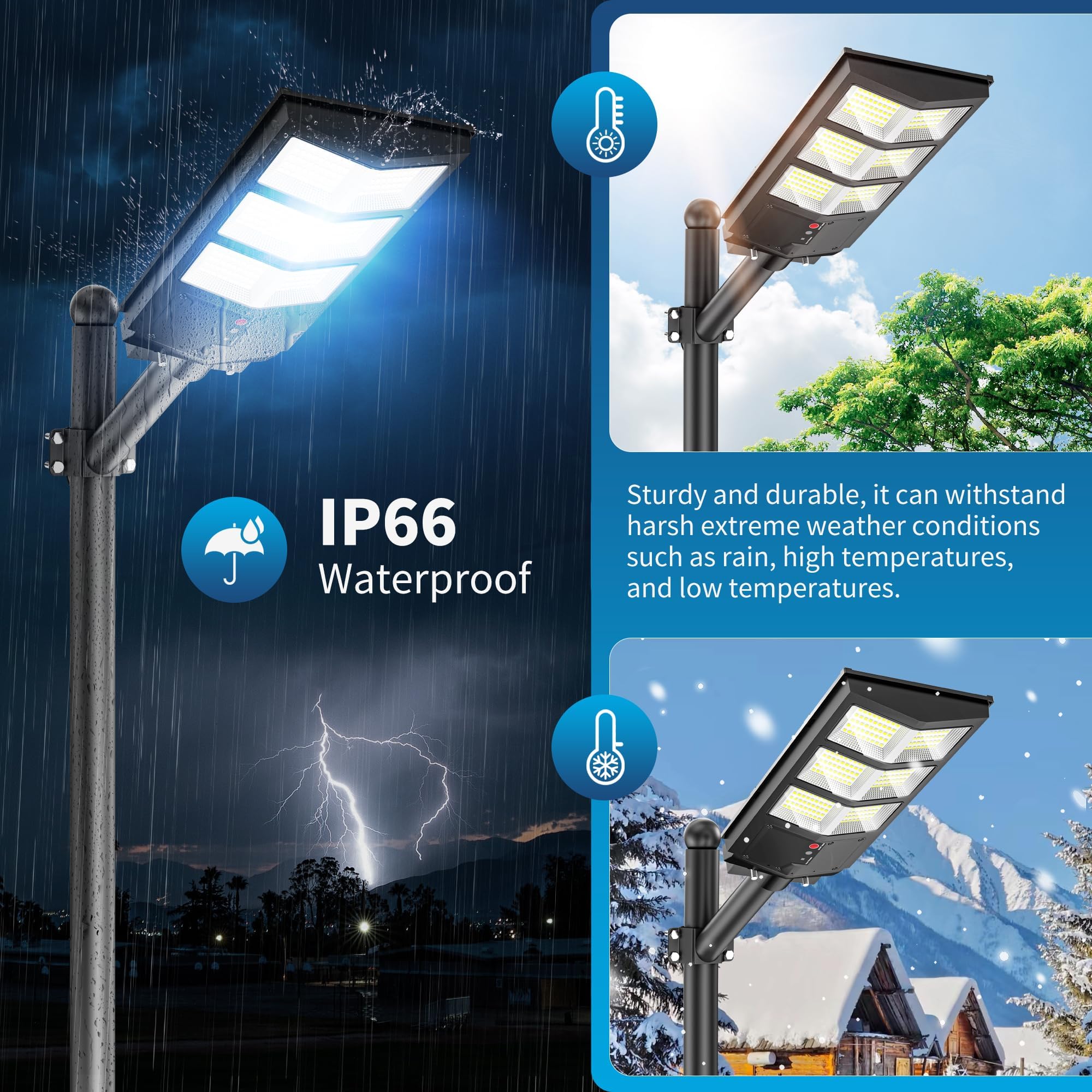 [SOLAR OUTDOOR LIGHT EASY INSTALLATION AND IP66 WATERPROOF] Our solar street light comes with all necessary installation accessories and requires no wiring. Simply fix the base where you want to install it. The solar lights outdoor are suitable for patios, parking lots, garages, gardens, pathways, streets, and yards, meeting diverse lighting needs effortlessly. outdoor solar light with an IP66 waterproof rating and made from high-quality ABS and die-cast aluminum bracket, it is sturdy and durable. Solar light outdoor capable of withstanding rain, high temperatures, low temperatures, and other extreme weather conditions.