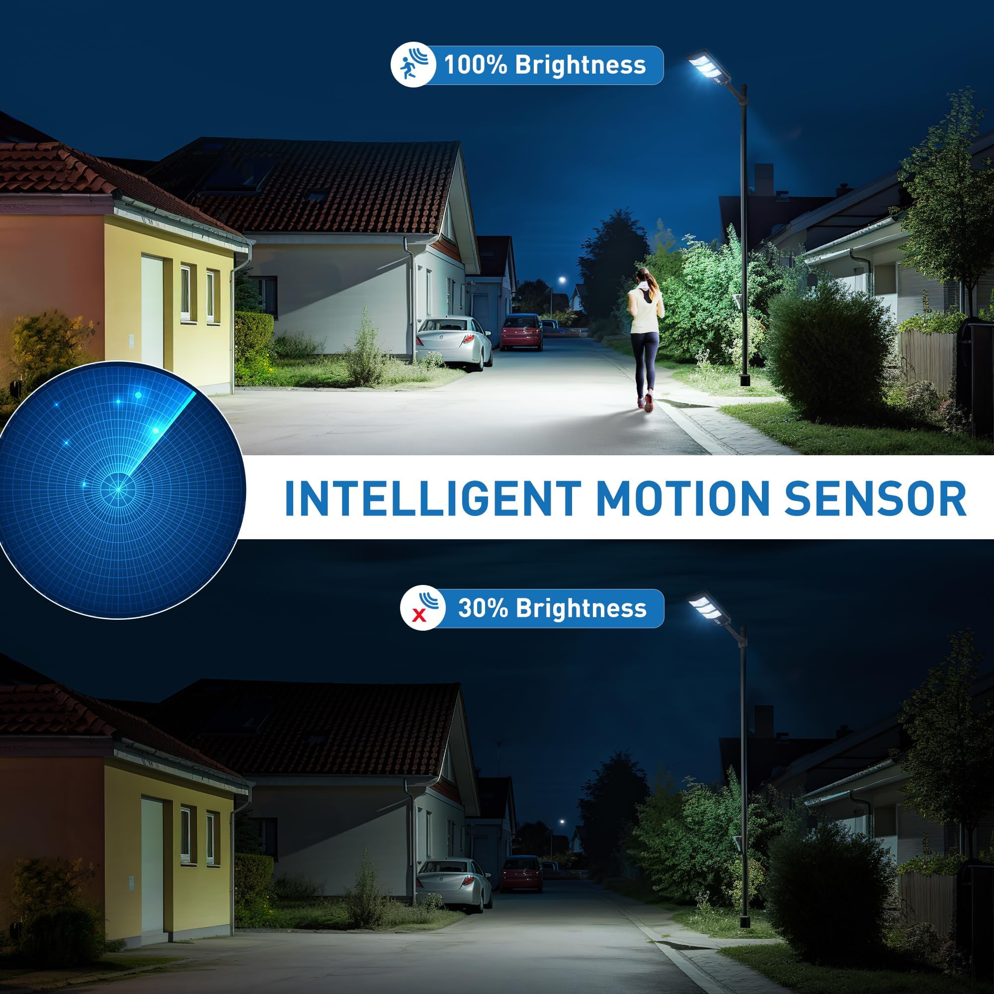 [SOLAR STREET LIGHT EQUIPPED WITH MOTION SENSOR AND TIMER SETTINGS] Mode 1: 100% brightness when motion is detected, 30% brightness when no motion is detected.Mode 2: 100% brightness when motion is detected, off when no motion is detected.Timer Settings:1-hour sensor / 2-hour sensor / 3-hour sensor / 5-hour sensor: After the set time, the solar light switches to sensor mode 1. 4-hour mode: The solar flood light turns off automatically after the set time. Multiple intelligent control modes enhance the versatility of these solar lights for outside.