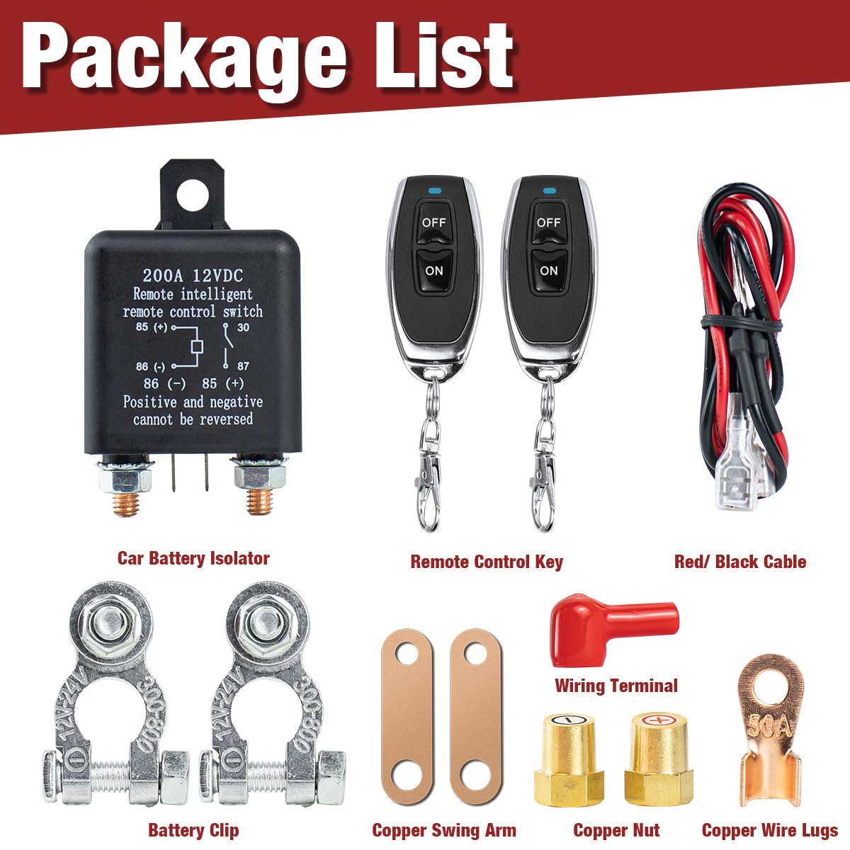 Features: Remote Control: Two Remotes Included Anti-Theft: Prevent Your Car from Being Stolen Easy of Installation: Extension Connectors Specifications: Item Type:Remote battery disconnect switch Material: ABS, copper, silver Voltage: DC 12V Rated Current: 200A Standby Current: 0.005A Working Temperature: -40 to 80 Degrees Notice : 1.For safty,pls make sure the product is working under 12V Operating Voltageļ¼Check carefully before purchase! 2.The switch is only for the battery,no work on engine! 3.Please read the manual carefully before installing, if you have any questions, we will solve it for you at the first time! Package List: Remote Battery Disconnect Switch*1 Remotes*2 Metal Clamps*2 Copper Plates*2