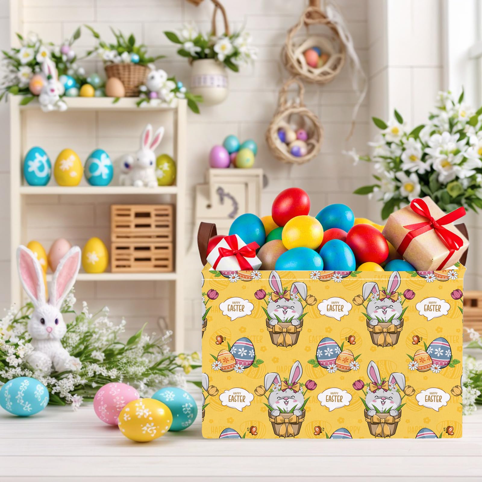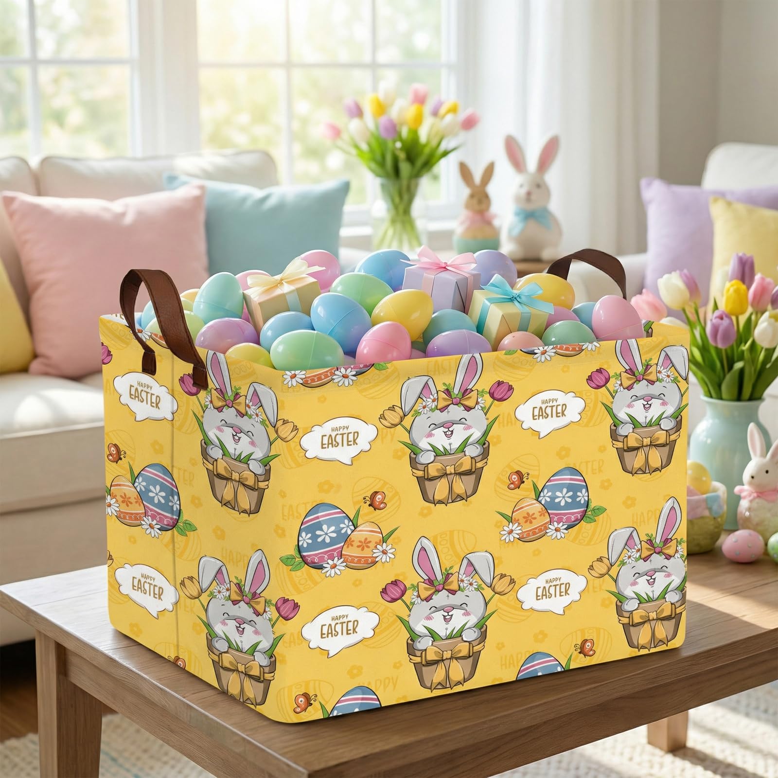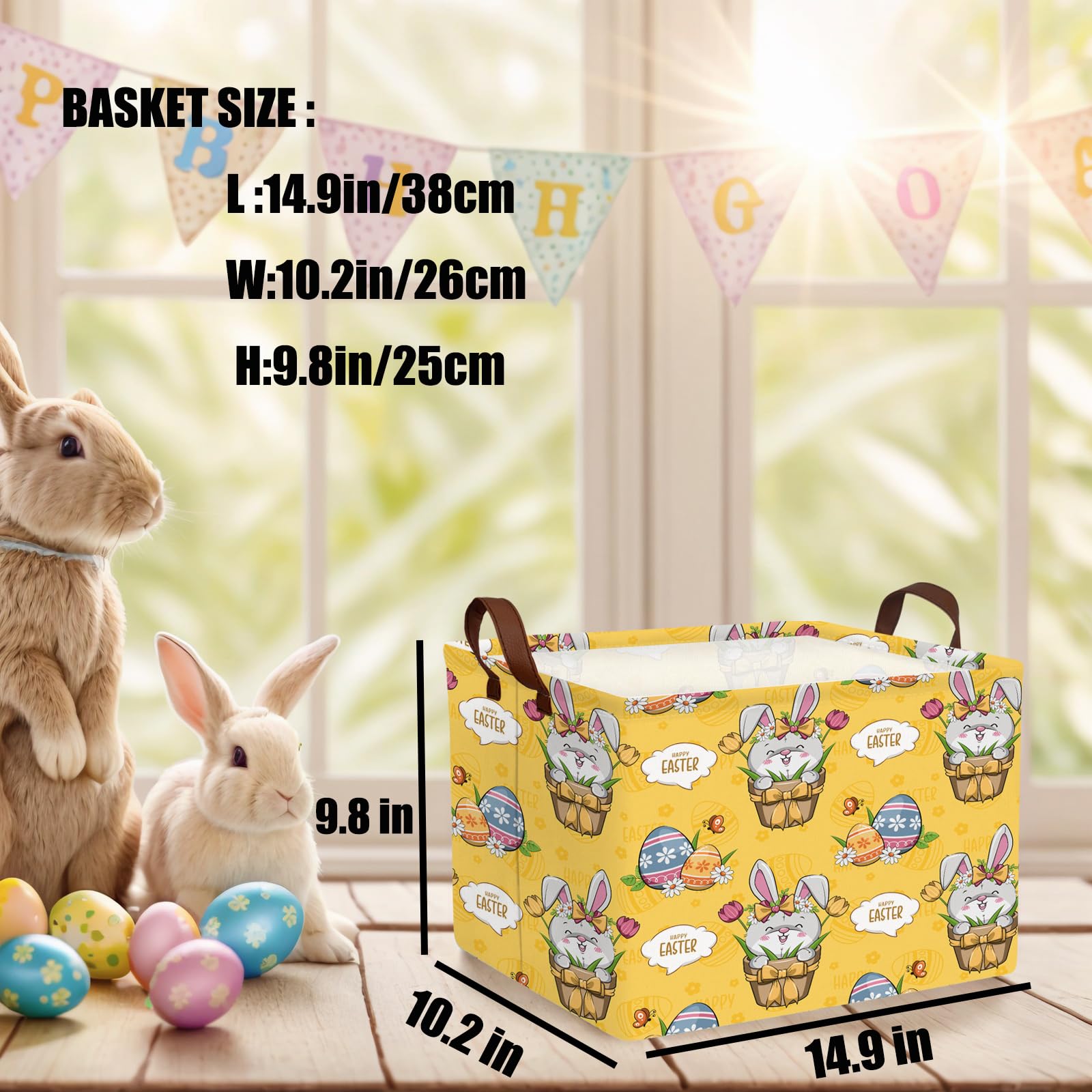Easter Basket - Perfect for searching for Easter eggs, storing holiday gifts and toys, as well as storing clothes, children's toys, books, and more. Applicable scenarios: laundry baskets, baby baskets, toy storage racks, wardrobe storage racks, etc. Our storage basket will be your trusted assistant. With our storage basket, you will have a fixed place to store items neatly and orderly, keeping your family and living space organized, efficient, comfortable, and relaxed. Bring our charming Easter basket and enter spring, adding a touch of creativity and organization to your family's celebration. Not just a traditional Easter egg searching container; It is a multifunctional accessory that your home uses throughout the year. Product specifications and materials: cotton, canvas. Size: 14.9L "x10.2" W x 9.8 "H inches. Packaging quantity: 1 storage basket. Please note that the basket may be compressed and wrinkled during long-distance transportation. It will recover after a period of use. Please allow manual measurement, with a measurement deviation of 0.3-1.2. Due to lighting effects, monitor brightness, and other factors, there may be slight differences in color between the photo and the actual item. Sincerely hope you can understand! 8. Only wipe clean, do not machine wash, use abrasive detergent.