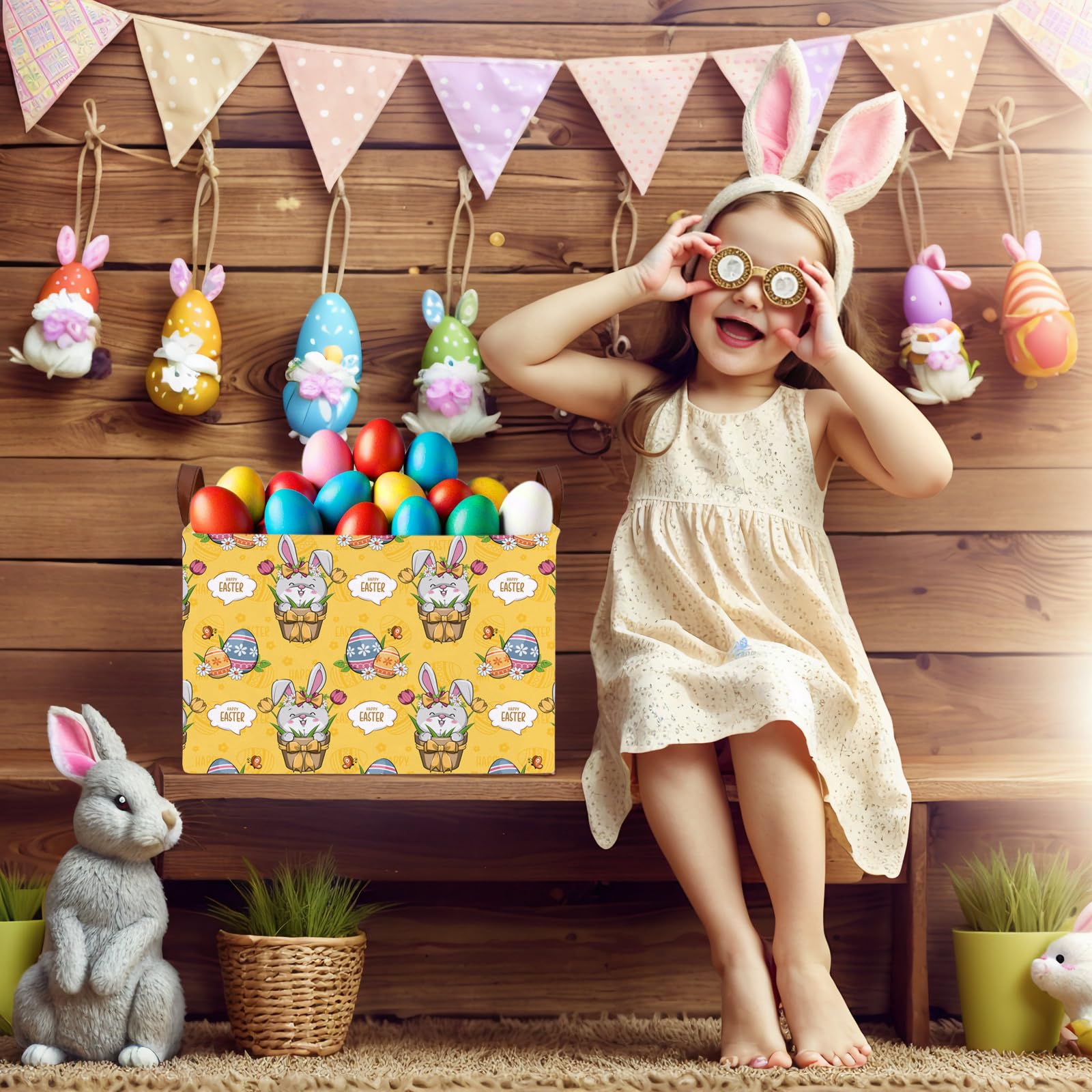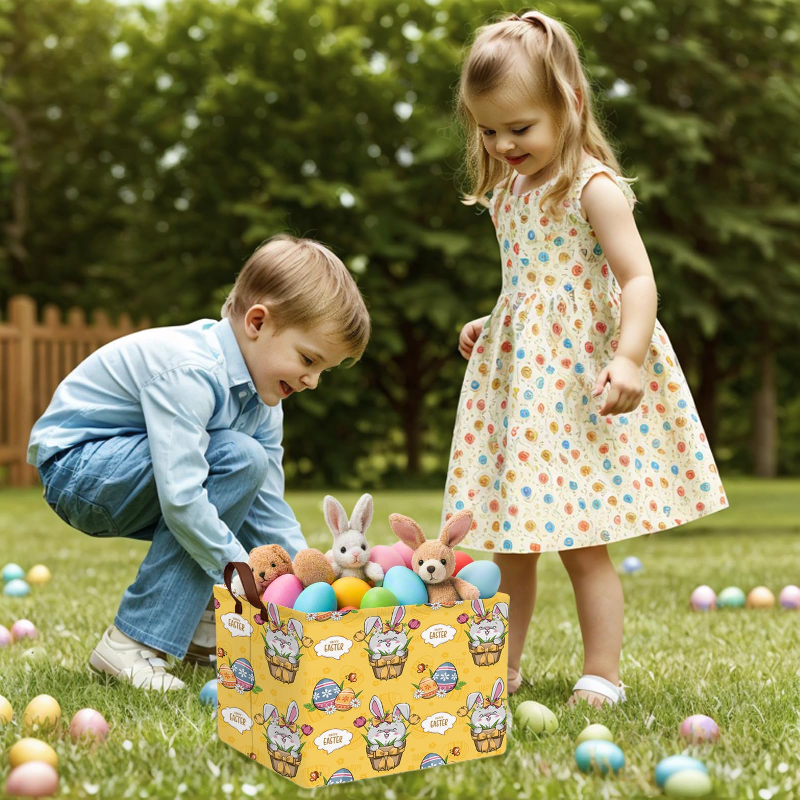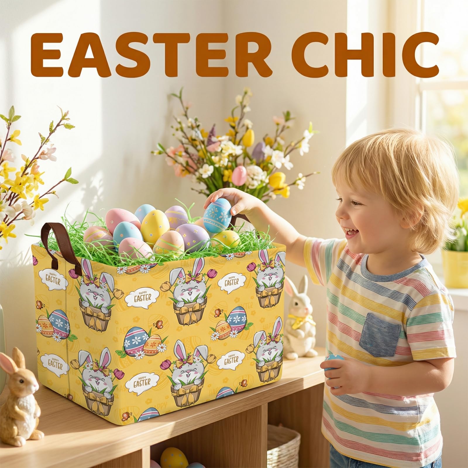 Easter Basket - Perfect for searching for Easter eggs, storing holiday gifts and toys, as well as storing clothes, children's toys, books, and more. Applicable scenarios: laundry baskets, baby baskets, toy storage racks, wardrobe storage racks, etc. Our storage basket will be your trusted assistant. With our storage basket, you will have a fixed place to store items neatly and orderly, keeping your family and living space organized, efficient, comfortable, and relaxed. Bring our charming Easter basket and enter spring, adding a touch of creativity and organization to your family's celebration. Not just a traditional Easter egg searching container; It is a multifunctional accessory that your home uses throughout the year. Product specifications and materials: cotton, canvas. Size: 14.9L "x10.2" W x 9.8 "H inches. Packaging quantity: 1 storage basket. Please note that the basket may be compressed and wrinkled during long-distance transportation. It will recover after a period of use. Please allow manual measurement, with a measurement deviation of 0.3-1.2. Due to lighting effects, monitor brightness, and other factors, there may be slight differences in color between the photo and the actual item. Sincerely hope you can understand! 8. Only wipe clean, do not machine wash, use abrasive detergent.