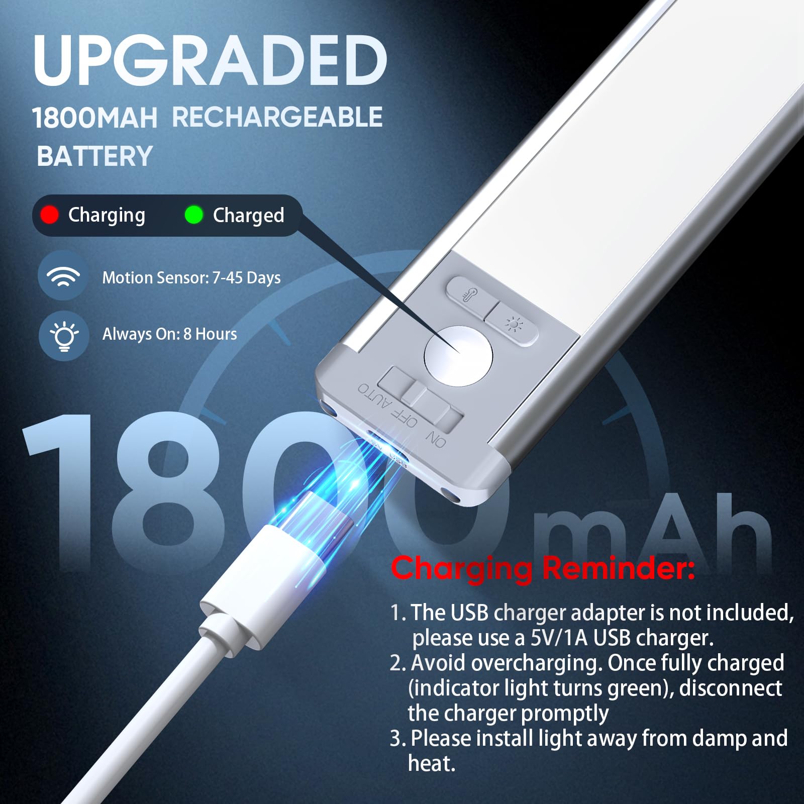 USB-C Rechargeable Under Cabinet Lights Wireless: These under cabinet lights built-in a 1800mAh rechargeable battery and can be easily recharged via type-C cable. Don’t worry about wiring, available outlets or battery replacement like other styles. One full charge can last up to 7-45 days on Motion Sensor Mode(depends on how often you use) and 8 hours on Always-on Mode at 100% brightness. Note that the USB wall adapter is not included