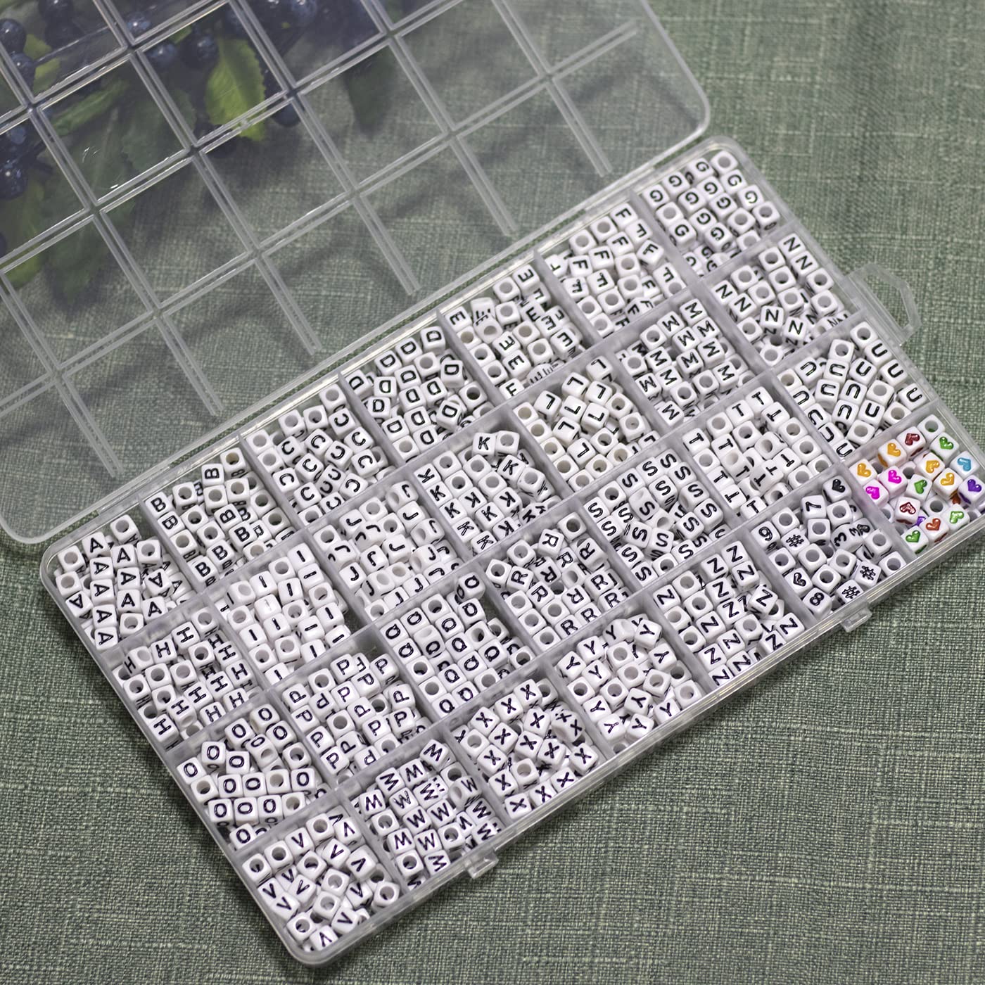 You will get: a 28-grid box with 26 letters, and a random mix of numbers and coloured heart beads. Each grid has 40 beads, the set has a total of 1120 6*6 square acrylic square beads.