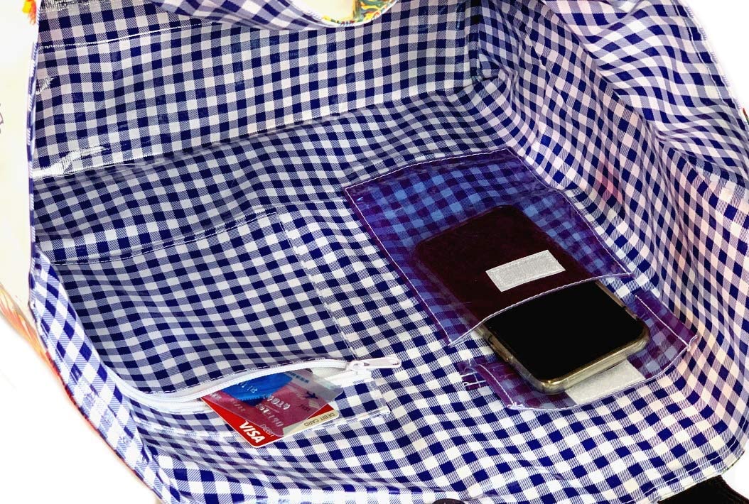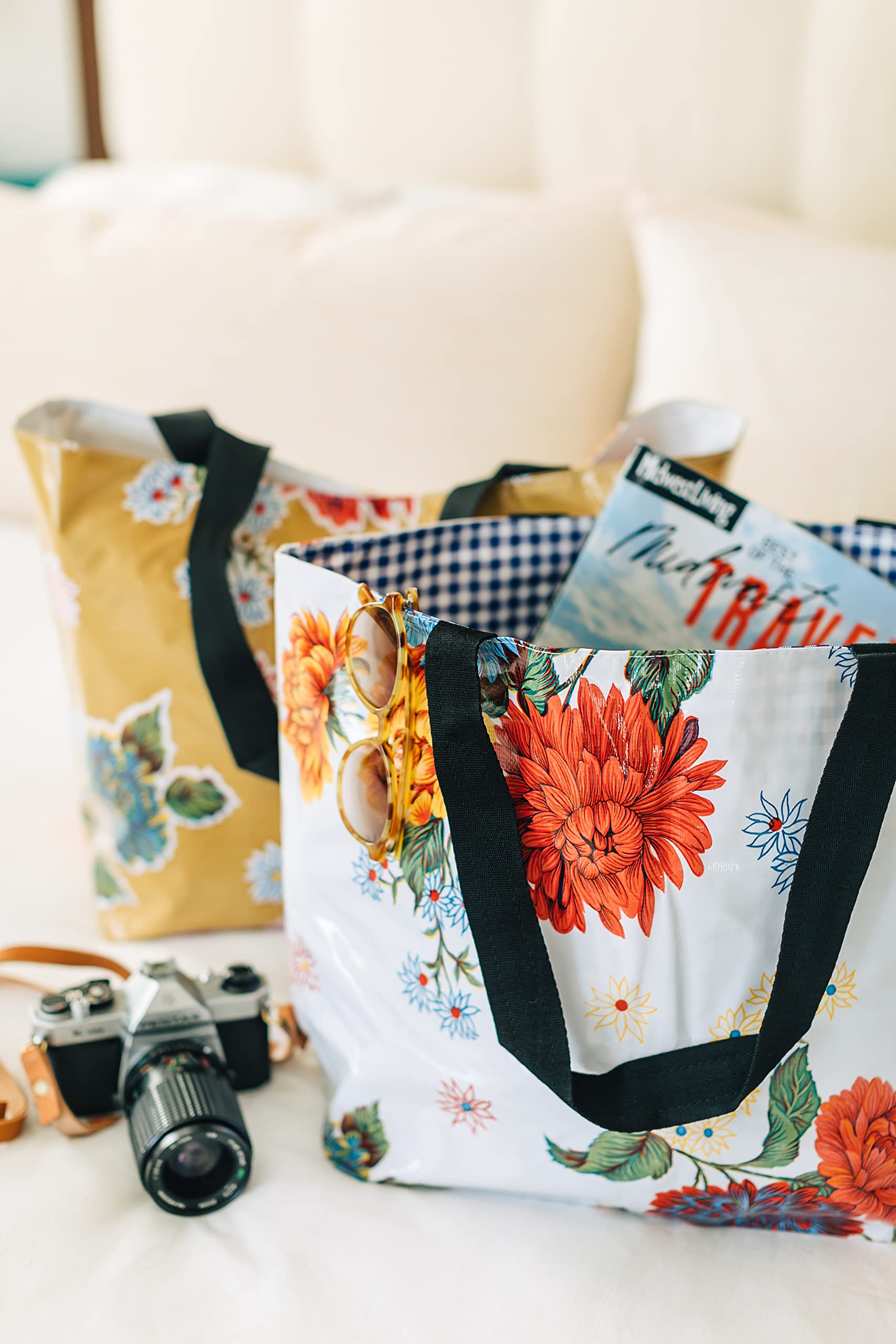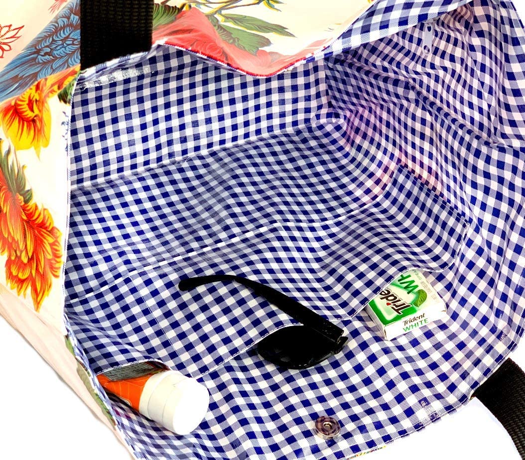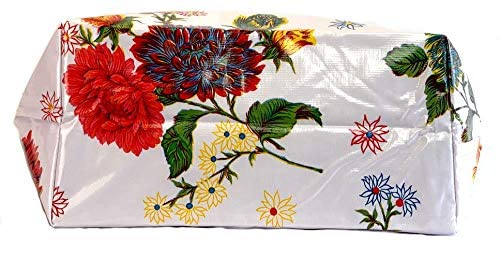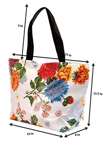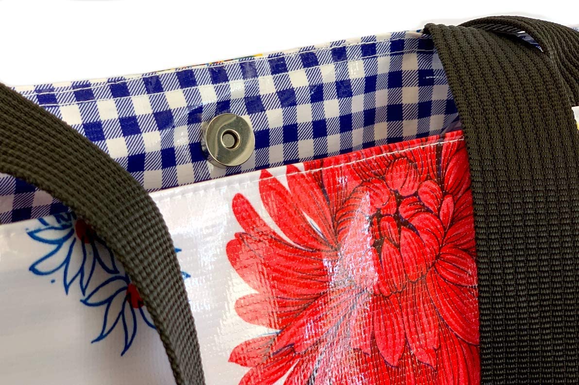 **Eco-Conscious and Durable**: Crafted from premium, up-cycled oilcloth, our tote is not only waterproof and stain-resistant but also supports a greener planet. Enjoy a fashion-forward tote that stands the test of time and use, without the environmental footprint of plastic bags.
