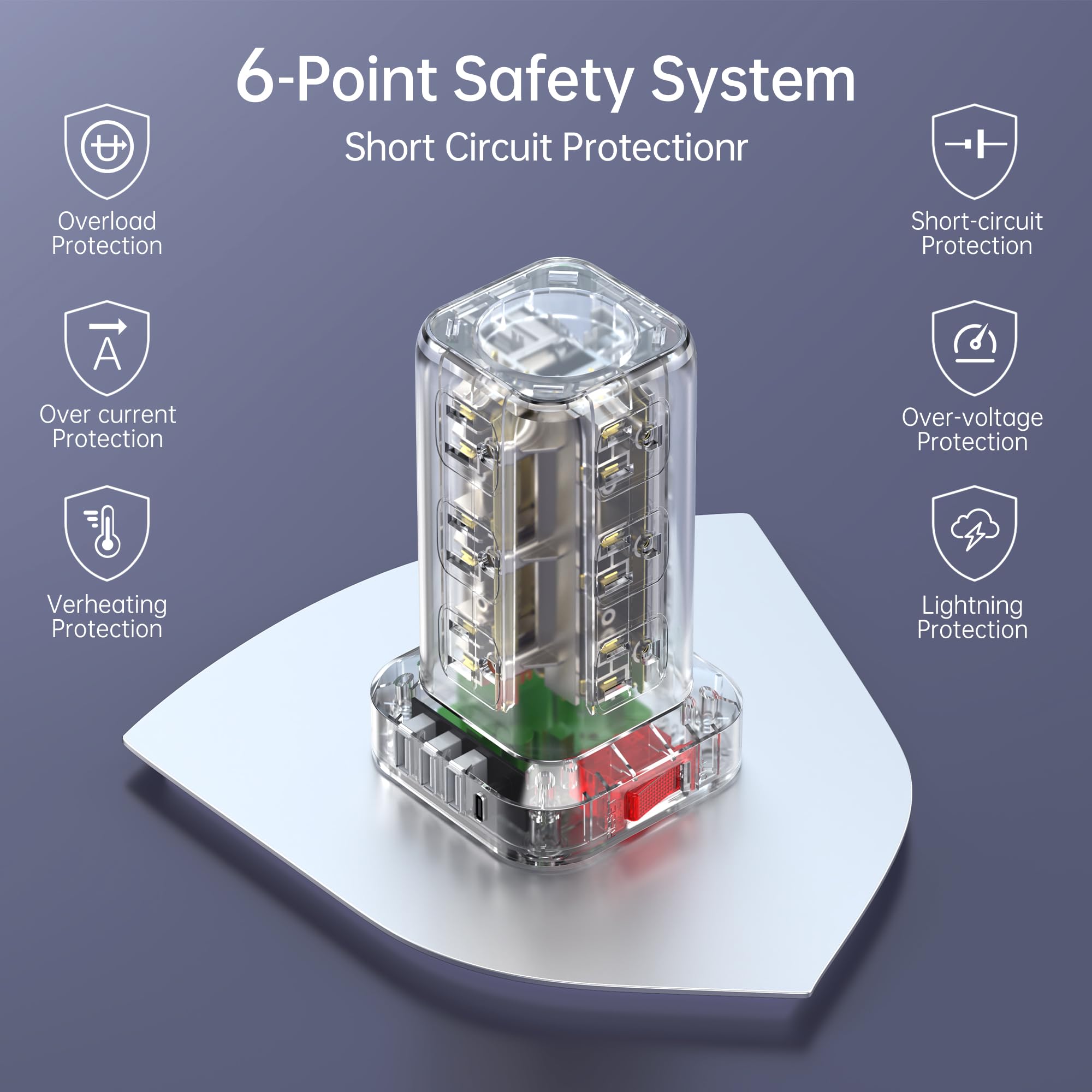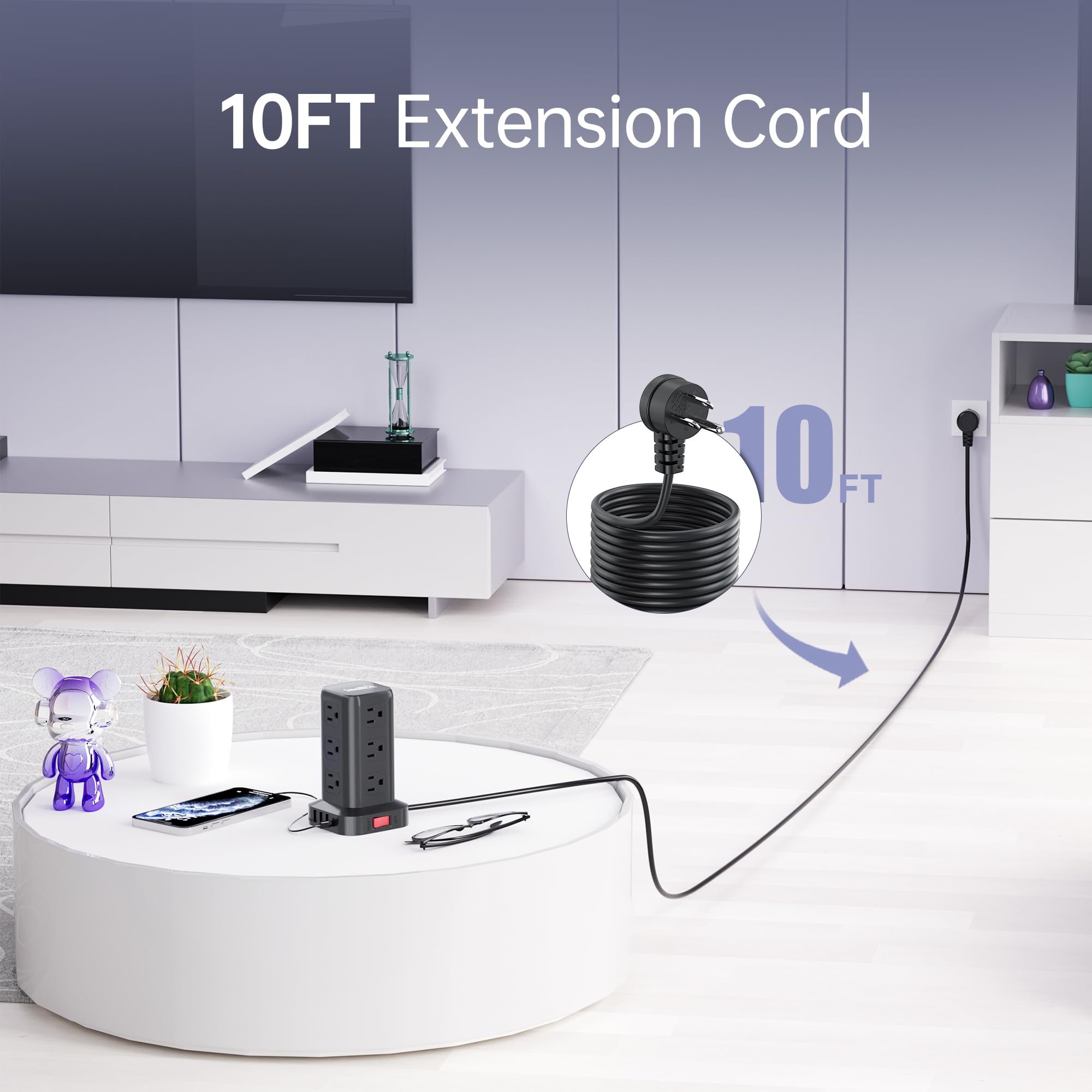 【10FT Extension Cord with Multiple Outlets 】The 10FT upgraded extension cord with multiple outlets is made of pure copper. Reinforced design at the junction of the stand of power strip tower and the wire head. To protect the terminal from wear and tear. Environmental protection and fire-resistance PC shell with flame retardant at 1382℉ makes it more safe and longer lifetime.