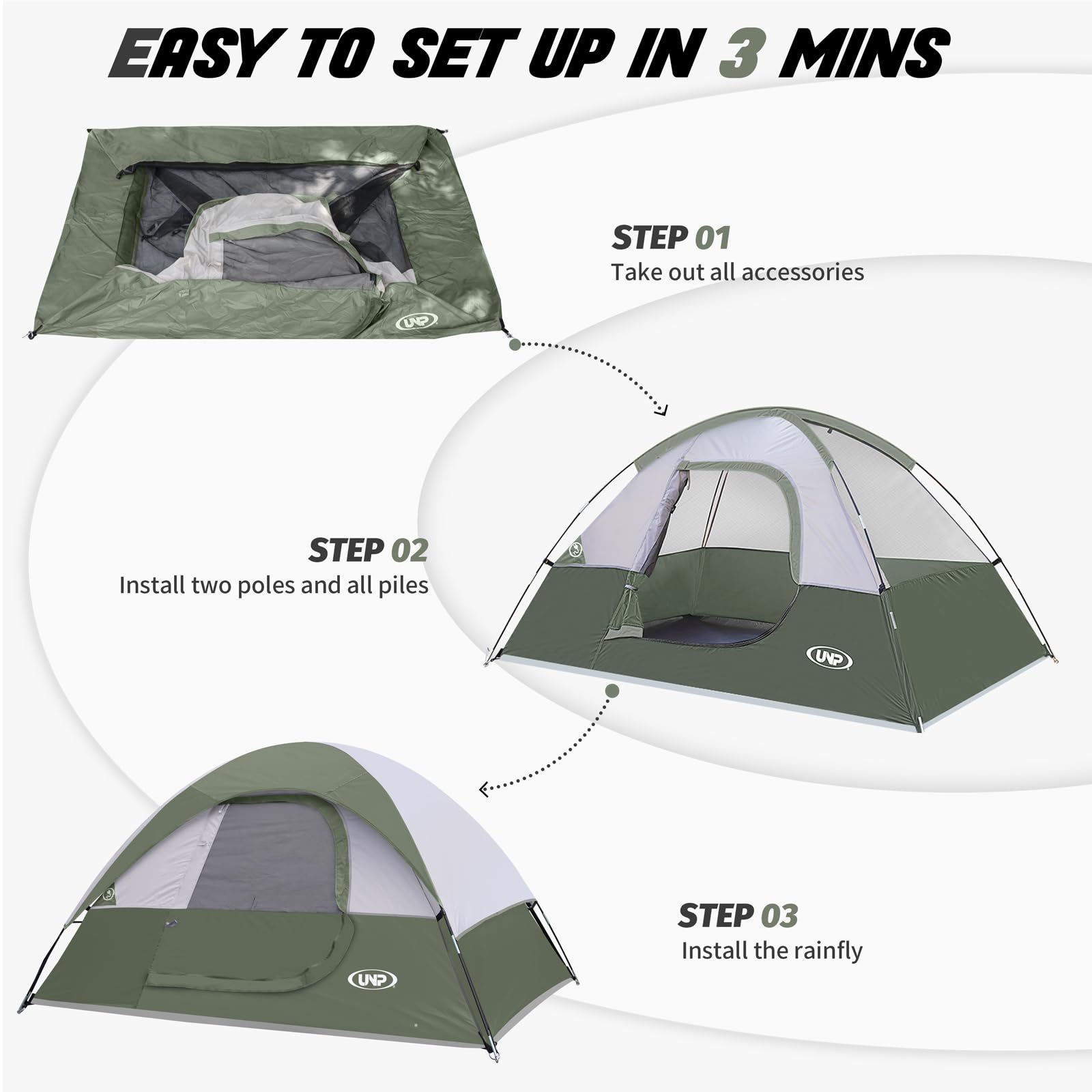 Easy To Set Up: The tents for camping that can be quickly assembled within 3 minutes and easily assembled by one person according to the procedures and instructions sewn inside the bag.