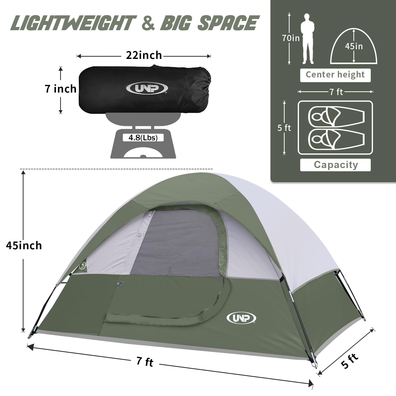 Lightweight & Big Space: 7'L x 5' x 45"H. Spacious room for 2 adults.Standard size fits 1 full air mattress.And this 2 Person tent weighs just 4.8lb,it's very easy to carry.This tent perfect for outdoor camping, hiking,climbing,a kid’s indoor or backyard play tent, fishing, or shelter at the beach in all weather.