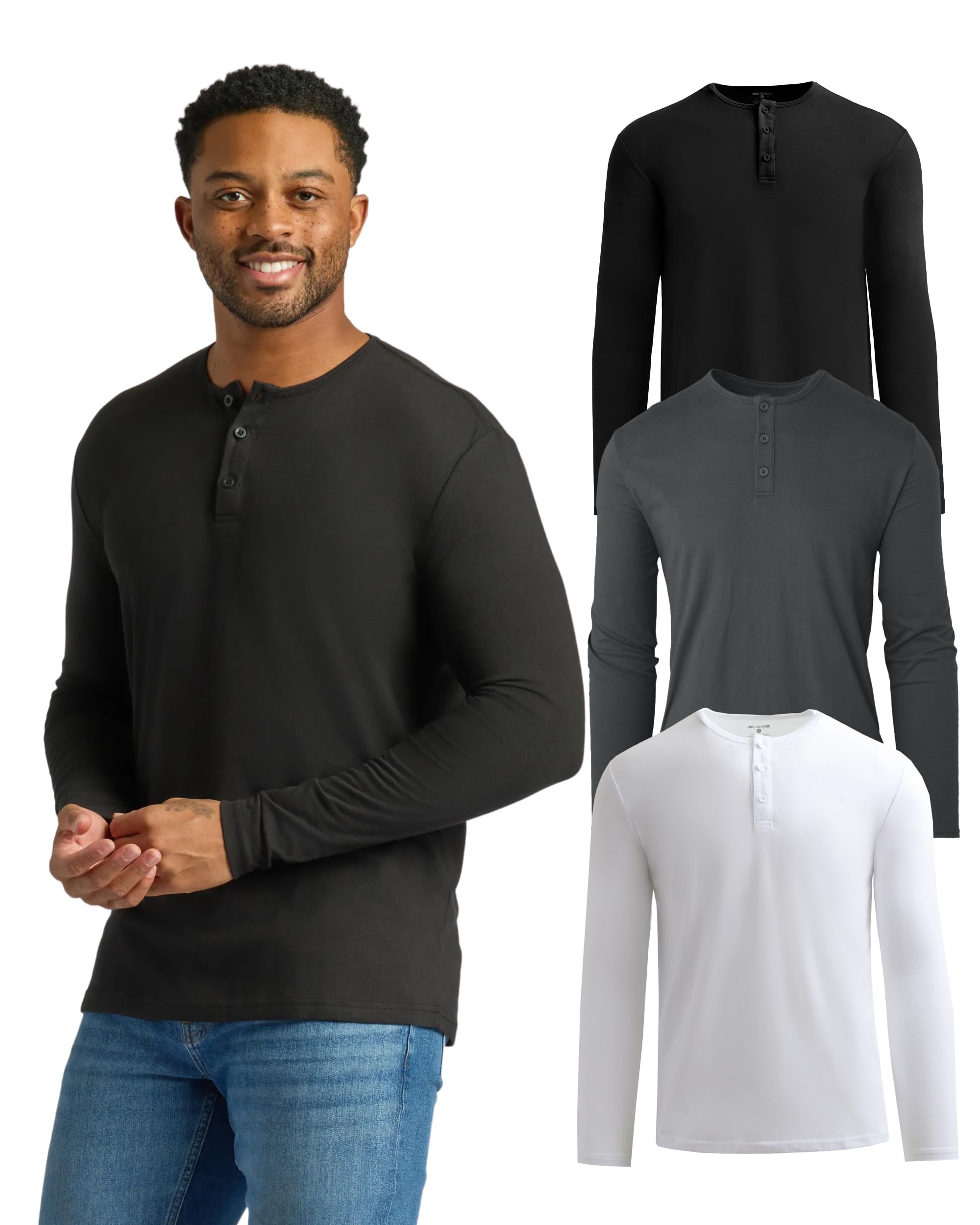 THREE WAYS TO WEAR: Choose your mens long sleeve shirt pack from our classic crew (60% combed ringspun cotton/40% polyester jersey), henley shirts for men long sleeve (same soft blend) or the thicker waffle-knit (49% Modal/49% Cotton/2% Elastane).