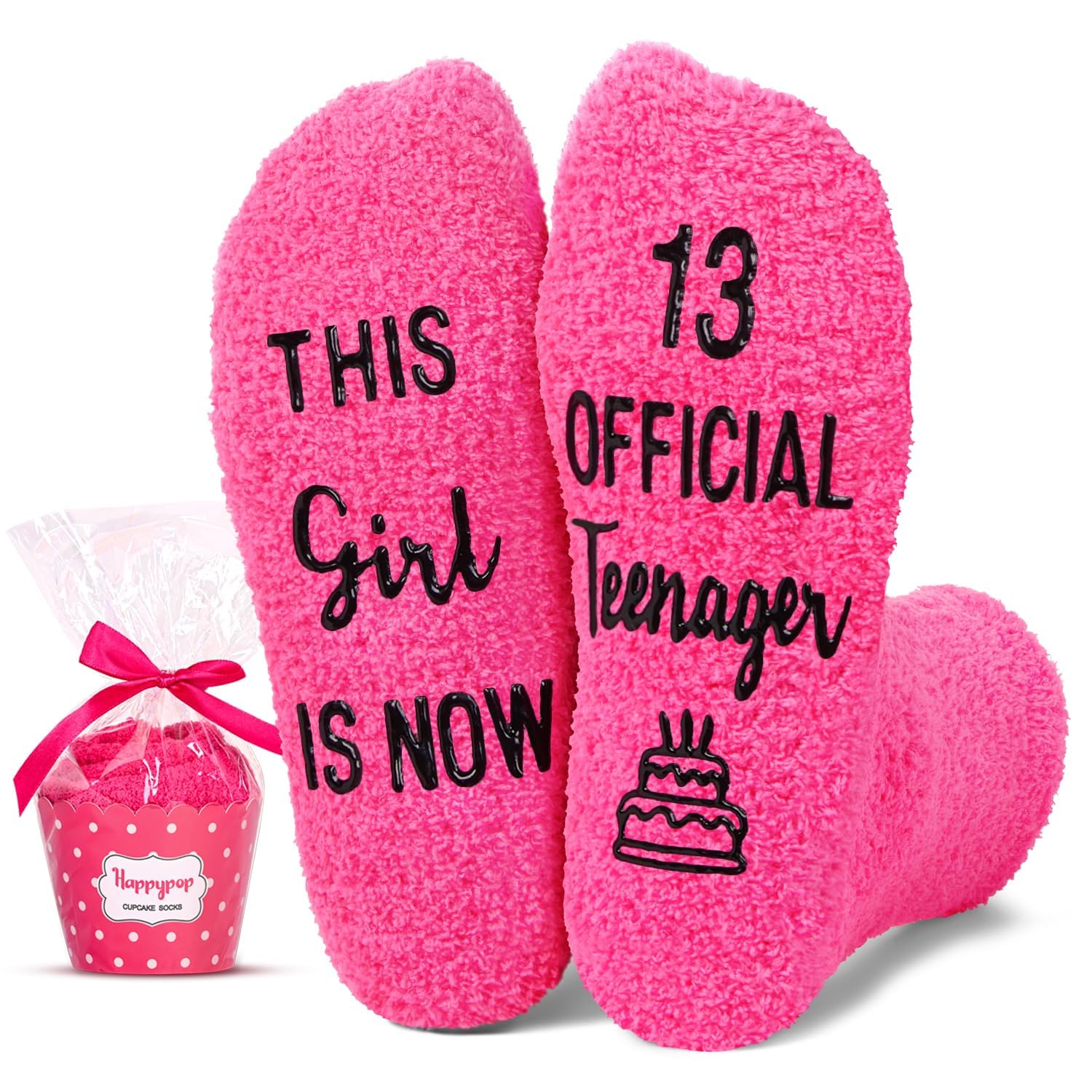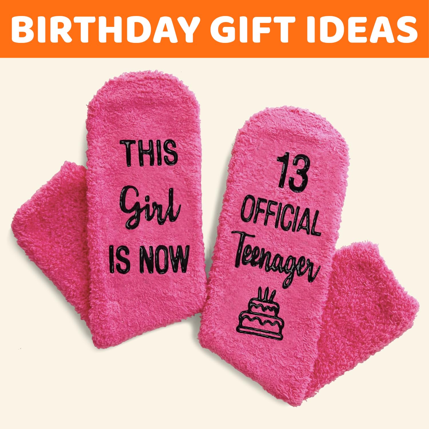 TEENAGE GIRL GIFTS: "THIS girl IS NOW 13 OFFICIAL Teenager" is printed on these cozy, fuzzy socks. They are suitable for any holiday gifts, such as birthday gifts, Christmas gifts, or White Elephant gifts.