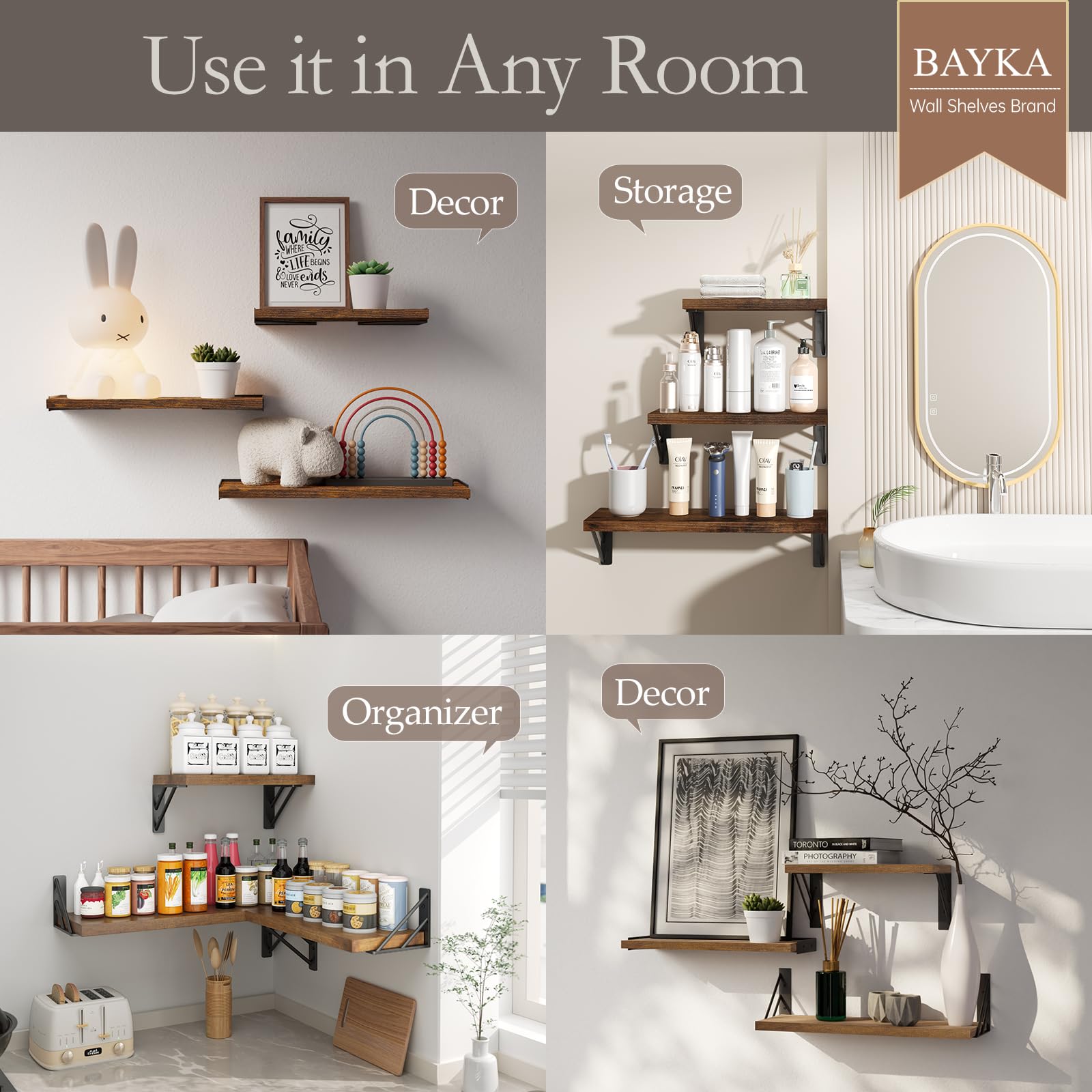 **Stylish Versatility**: Elevate your home decor with BAYKA floating shelves, seamlessly blending into any room decor while offering practical storage solution