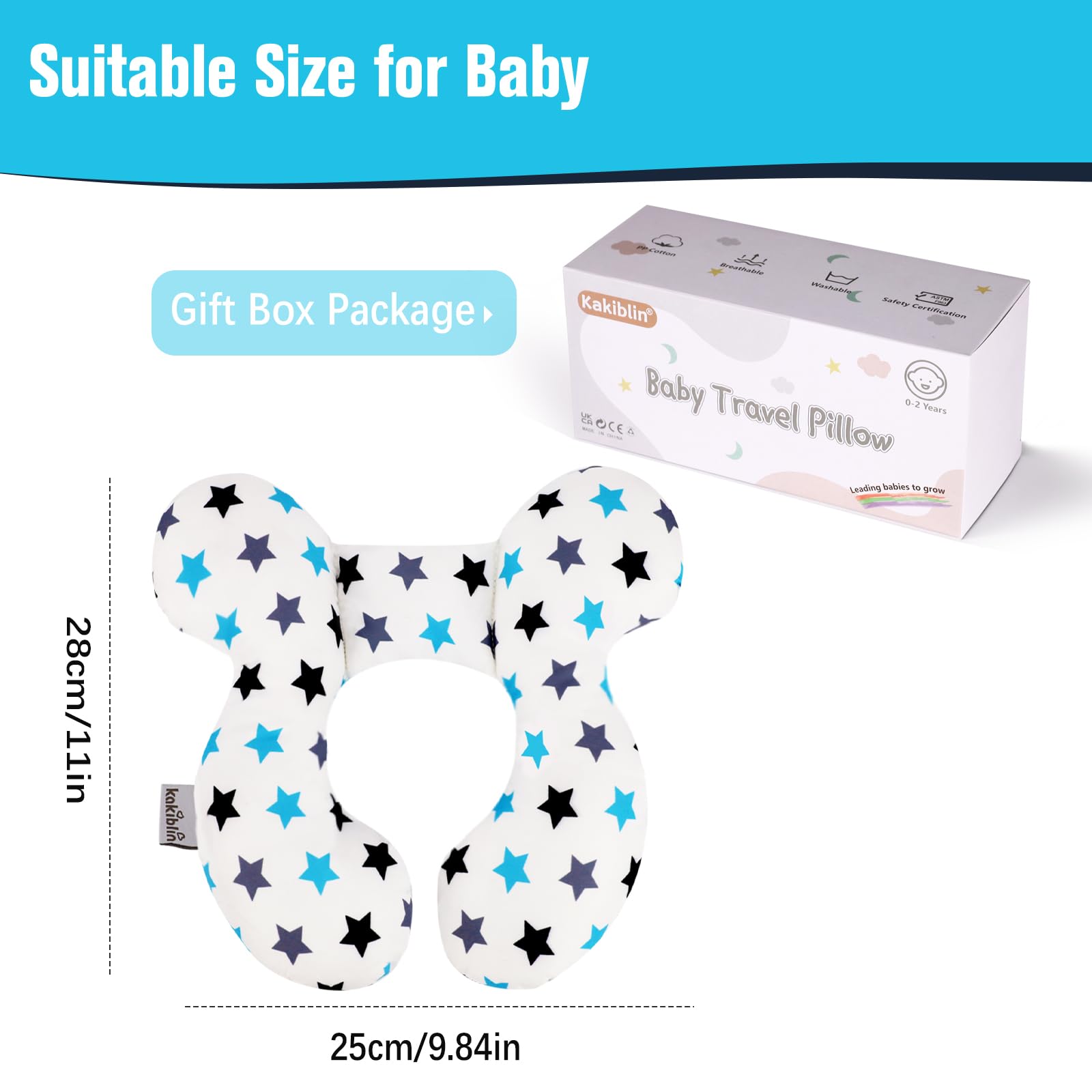 Machine Washable,the whole baby pillow can be washed in machine (30℃/86℉), size:25*25cm, suitable all the season,package with a box